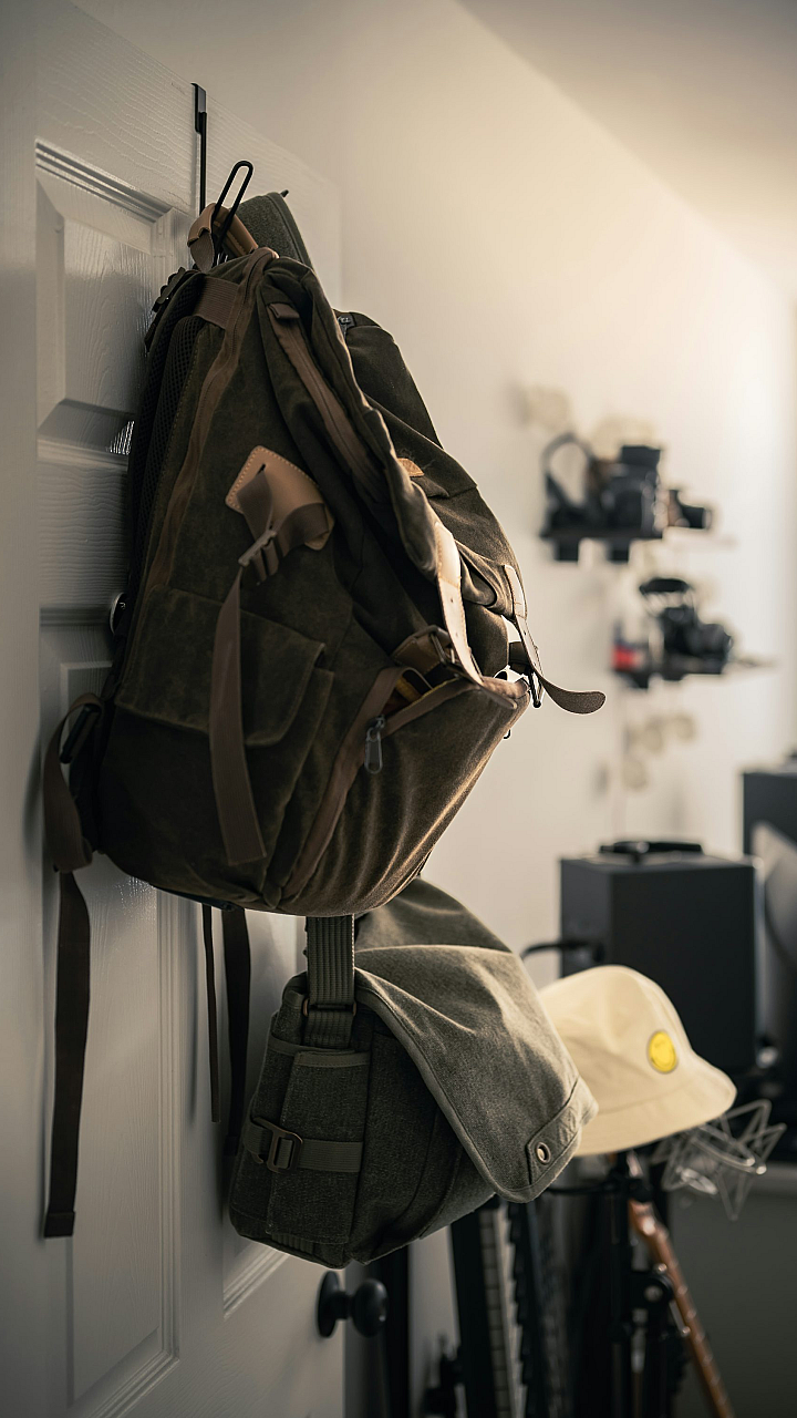 The backpack is the focal point, highlighting its design and texture. The wall provides a complementary backdrop, emphasizing the backpack’s details. The overall mood is one of calmness and quiet adventure, reflecting a sense of preparation and readiness for travel or exploration.