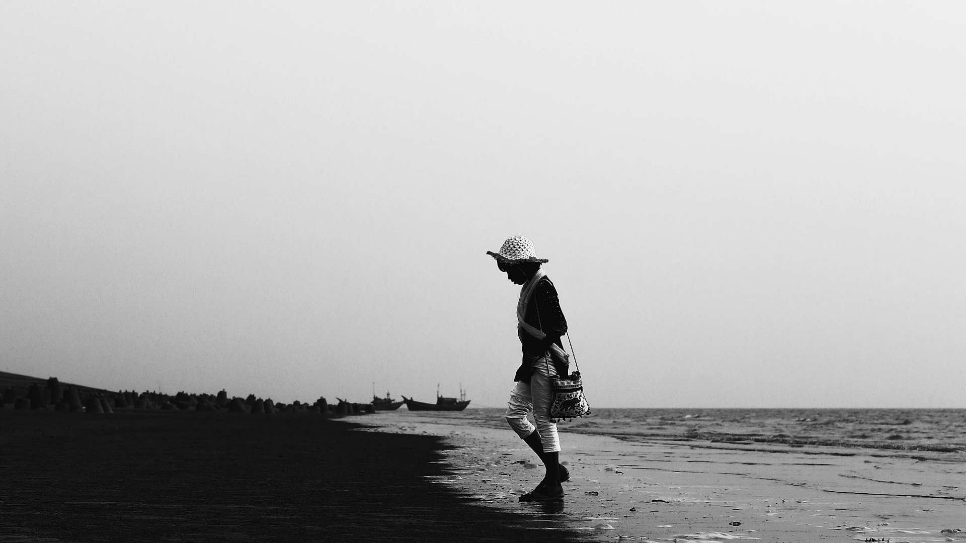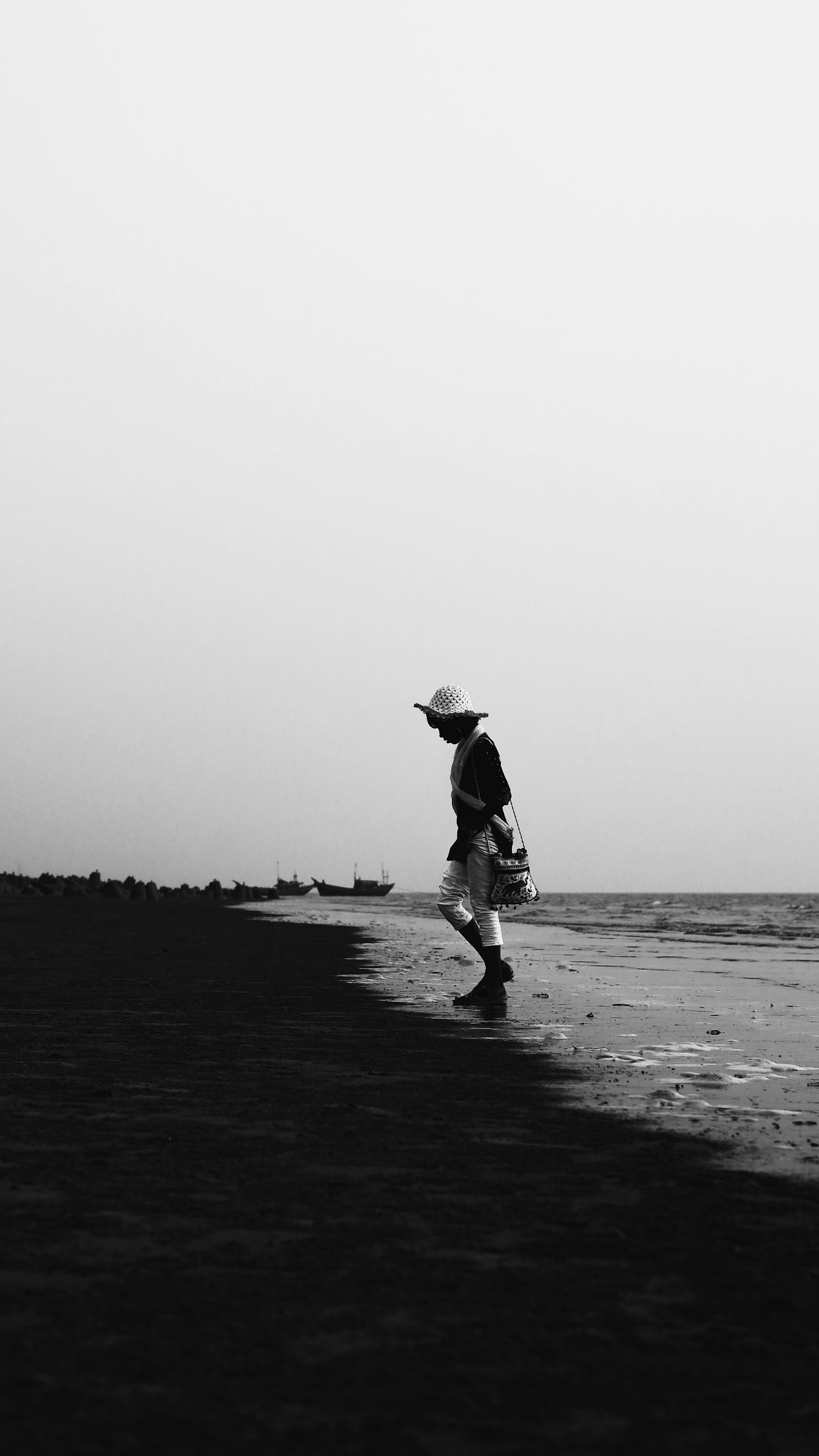 black and white, beach, walker, person, seashore, coast, ocean, sand, waves, monochrome, walking, solitude, landscape, silhouette, photography