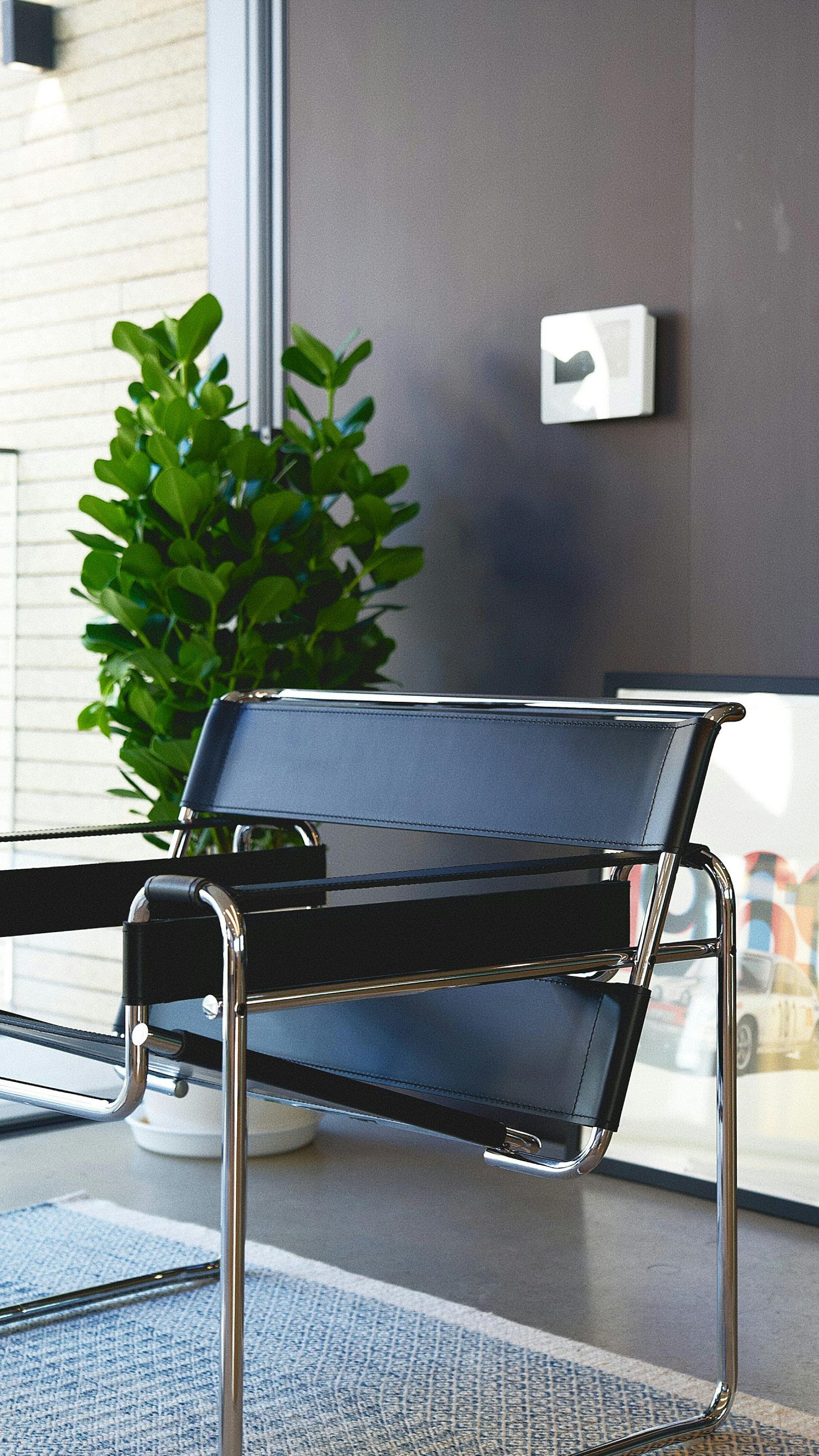 black chair, rug, plant, interior, home decor, minimalist, simple, modern, furniture, room decor, houseplant, sitting, cozy, calm, still life