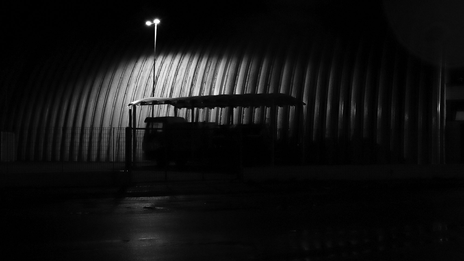 This wallpaper features a captivating scene of a bus shelter bathed in the soft glow of illumination, standing stark against the darkness of the night. The contrast between the warm light and the deep shadows creates a visually striking image.