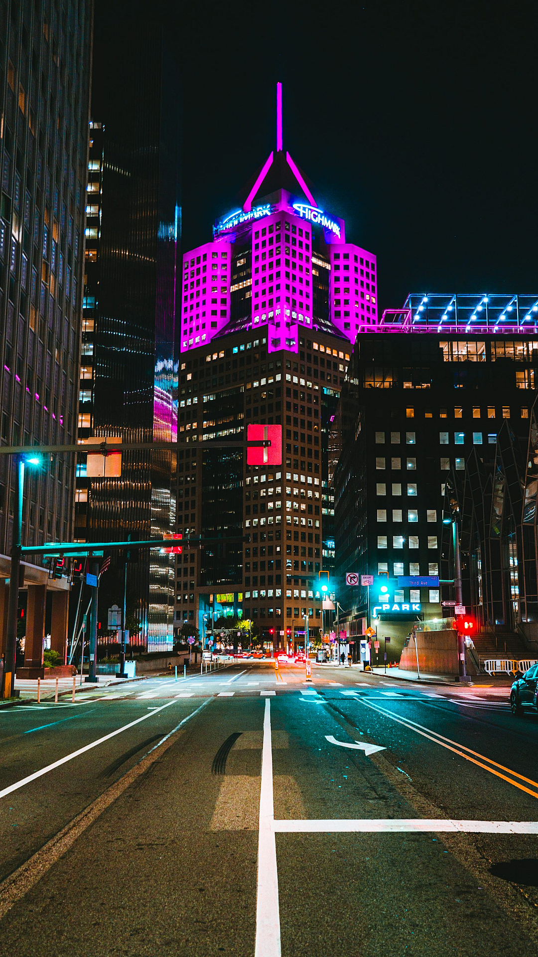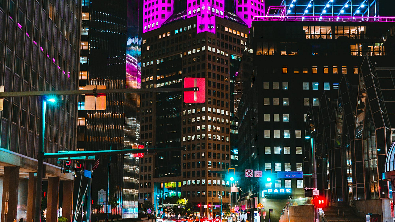 city street, night, buildings, lit up, illuminated, urban, cityscape, night scene, city lights, streetlights, architecture, night photography, evening, dark, glow