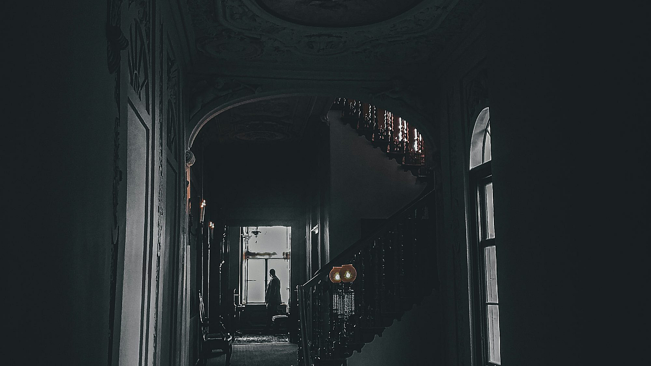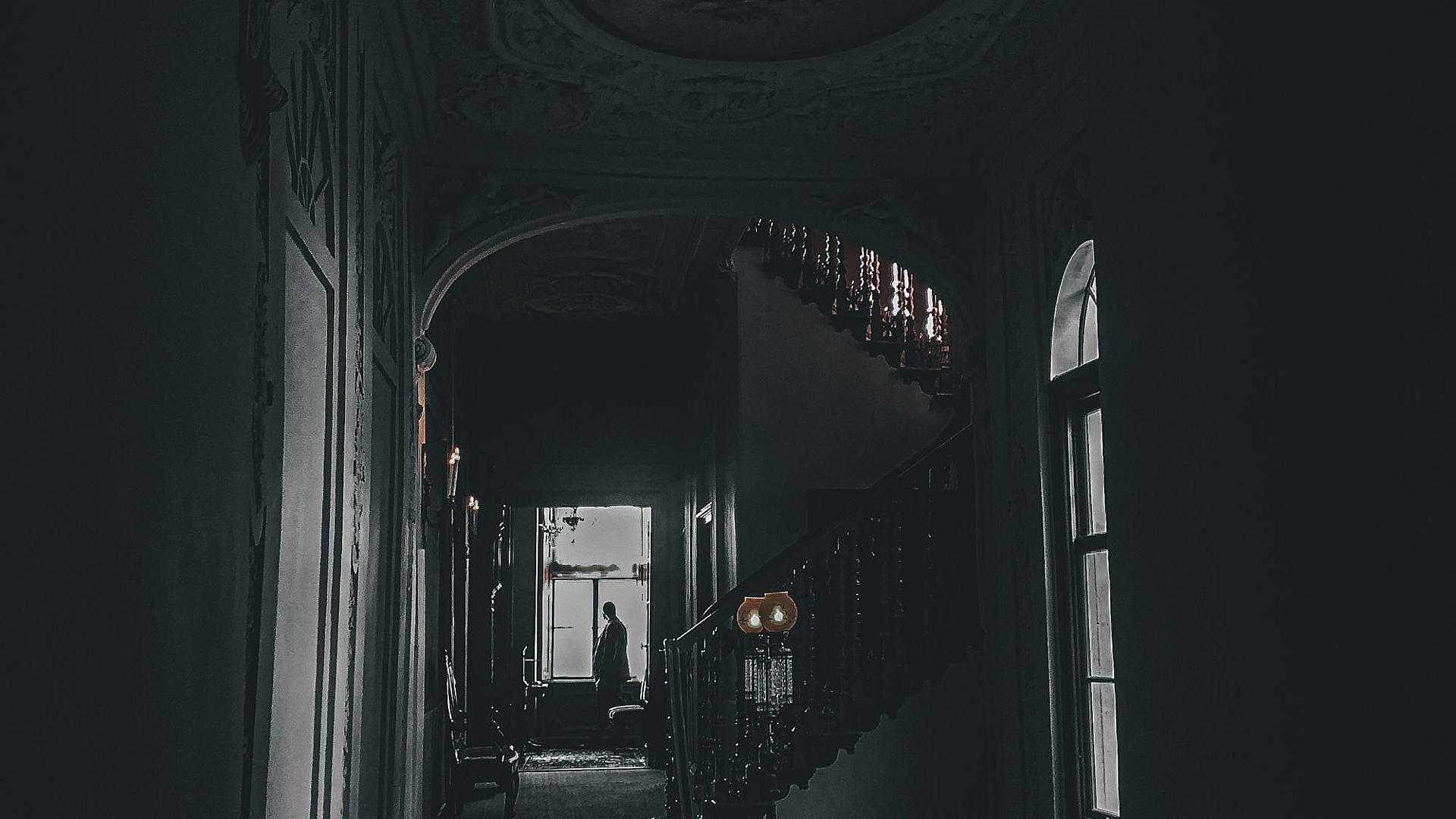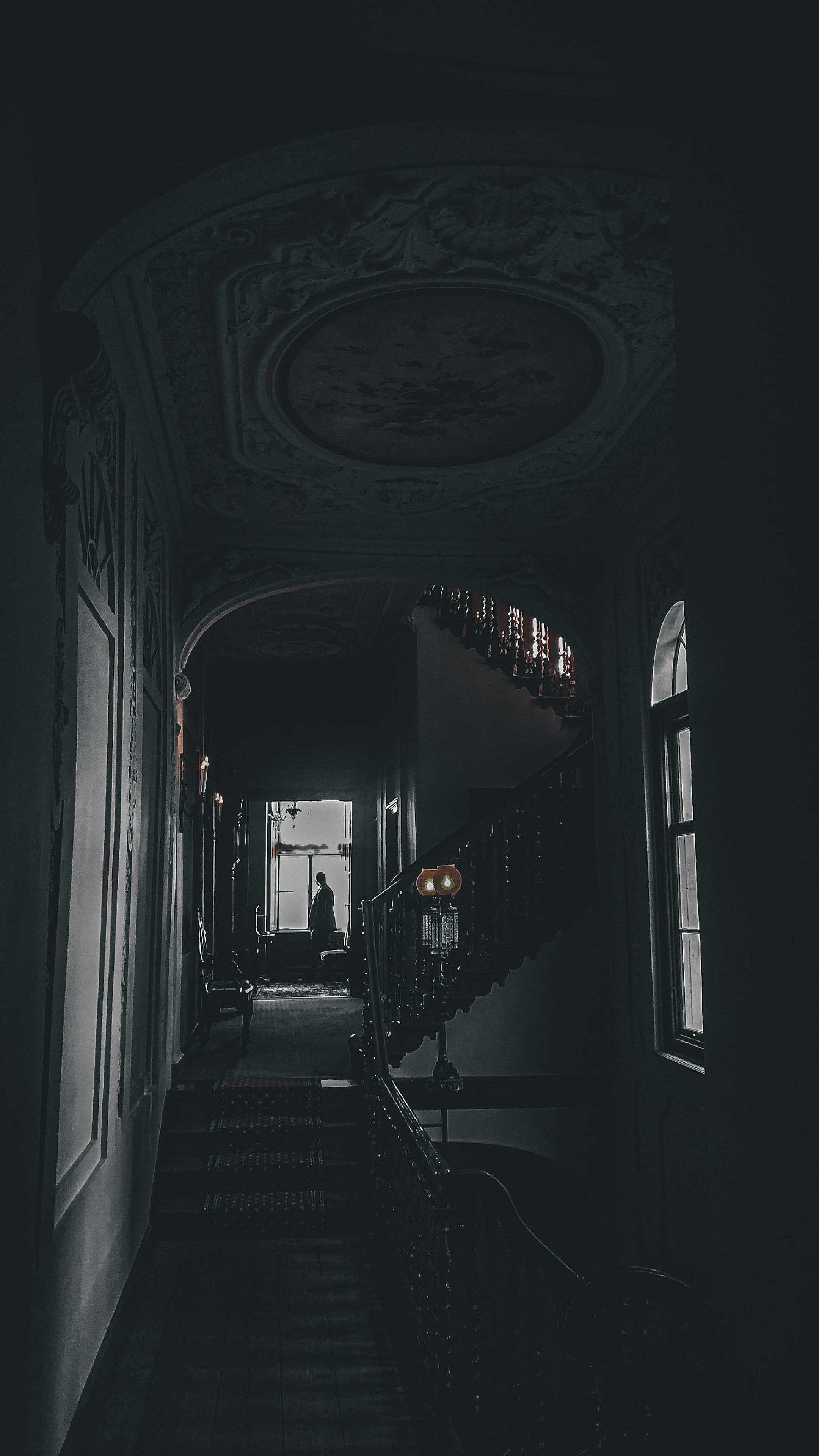 dark hallway, staircase, stairs, dark, shadowy, gloomy, dimly lit, interior, architecture, room, passage, corridor, mysterious, enigmatic, creepy