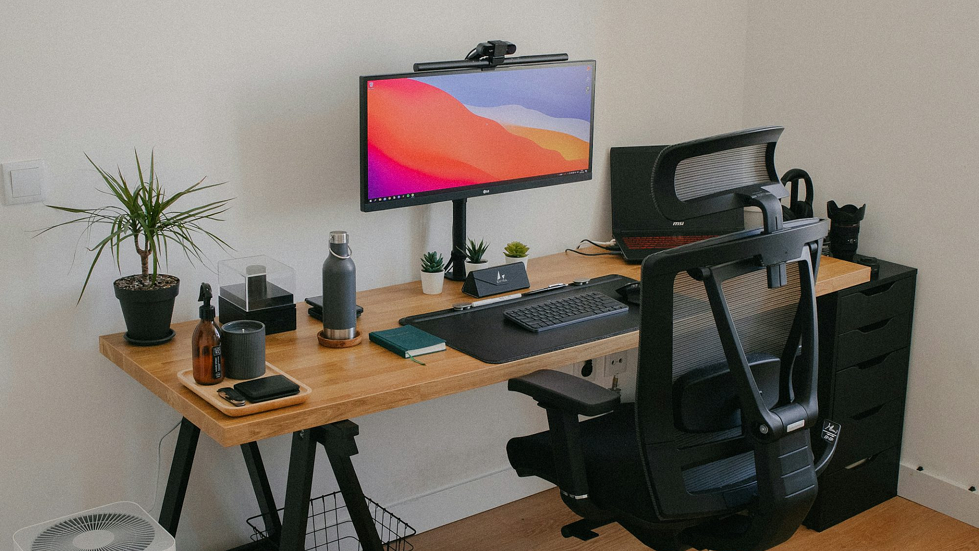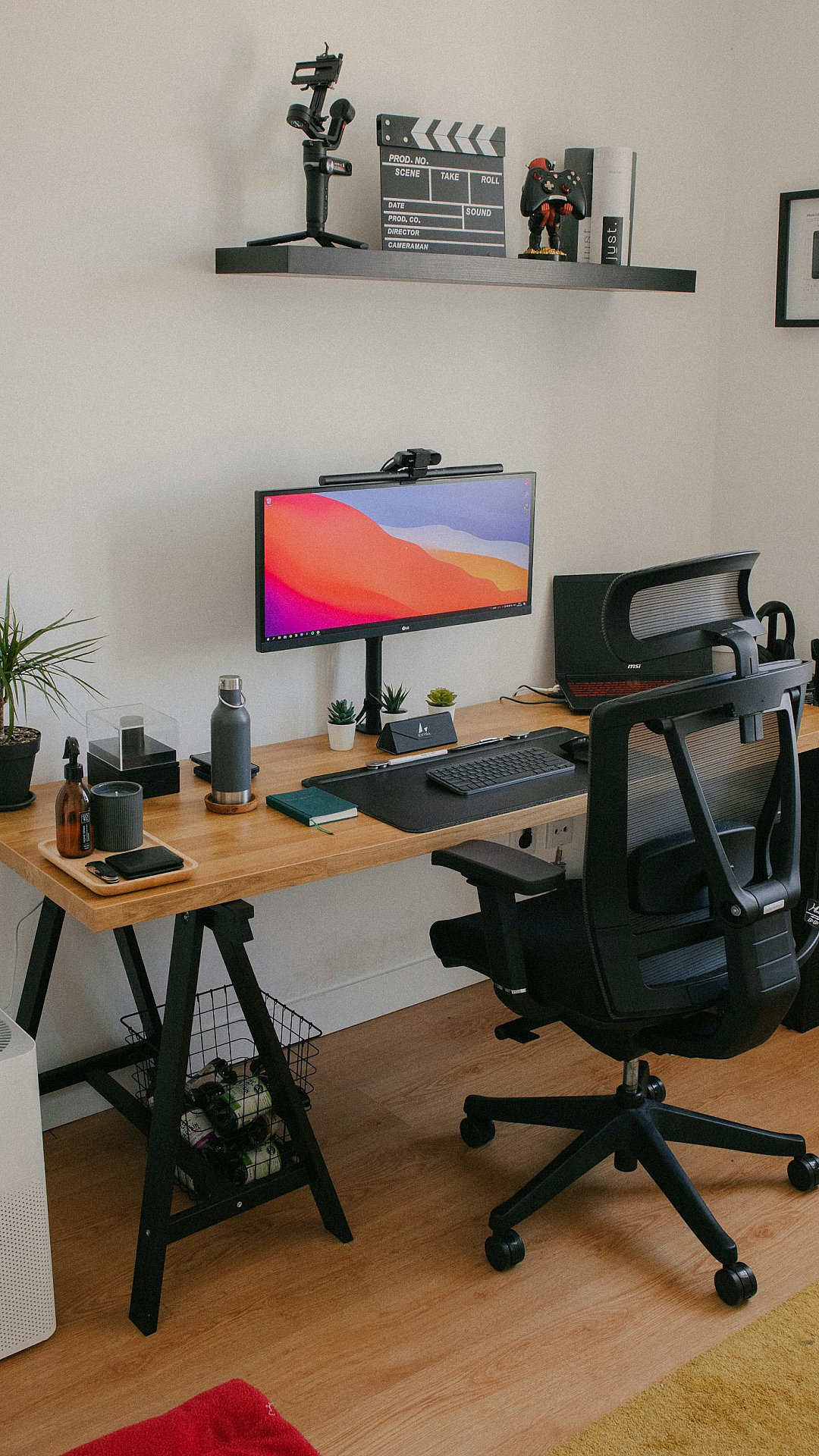 Keywords: desk, computer, chair, room, shelf, workspace, office, study, home office, interior, furniture, technology, digital, workstation, setup