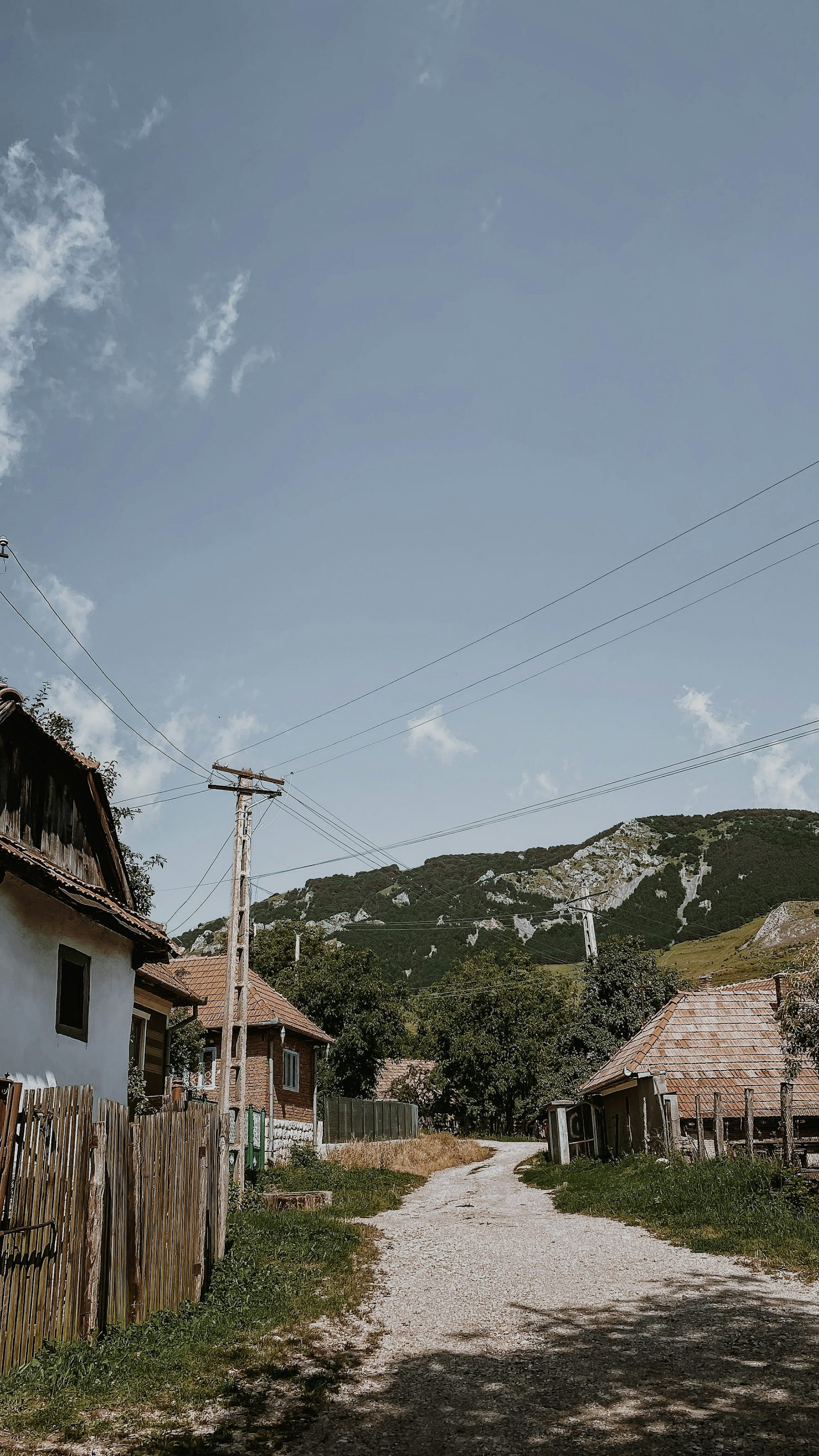 dirt road, unpaved road, country road, rural road, houses, homes, buildings, mountain, mountains, hills, landscape, scenery, nature, background, wallpaper
