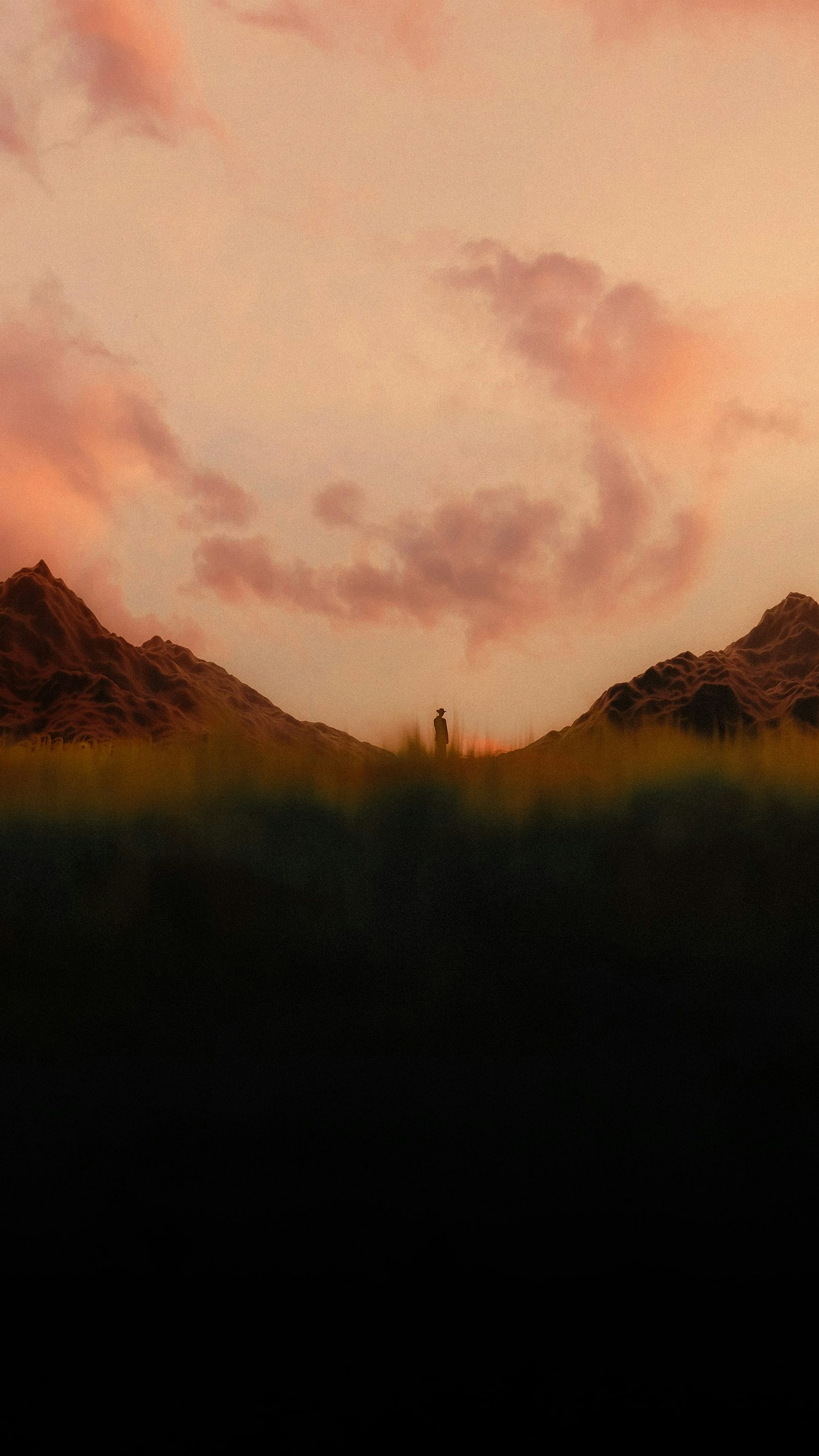 This stunning wallpaper features a picturesque field stretching out towards a majestic range of mountains. The sky above is filled with dramatic clouds, adding depth and interest to the landscape. The overall feel is one of serene nature, perfect for a calming and beautiful scenery on your desktop or mobile device.