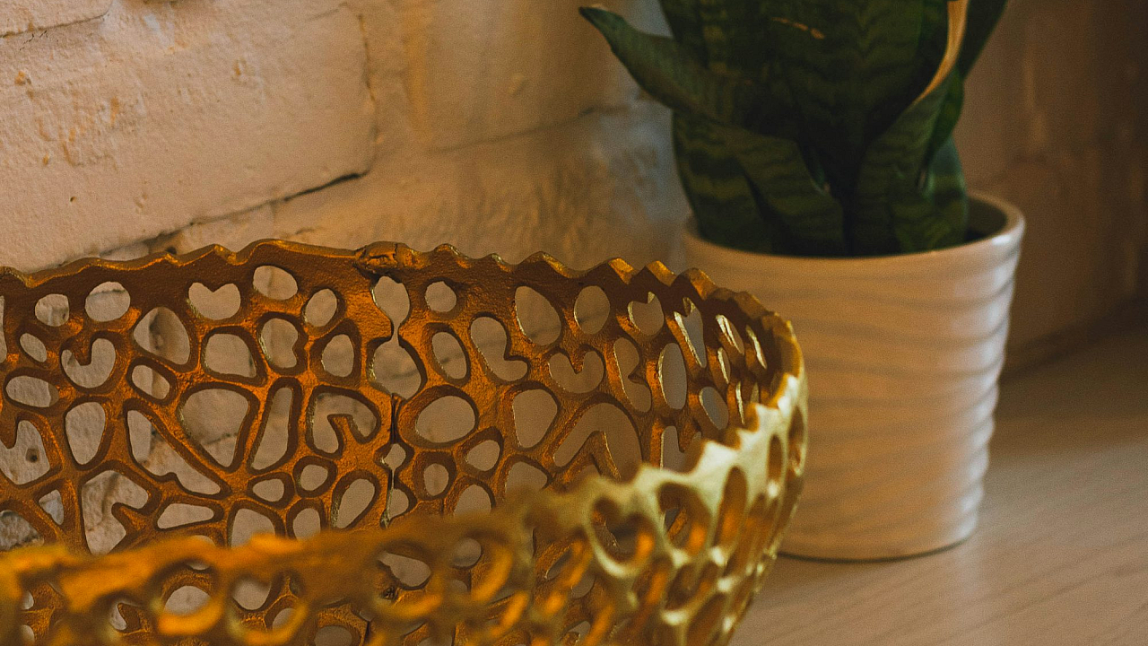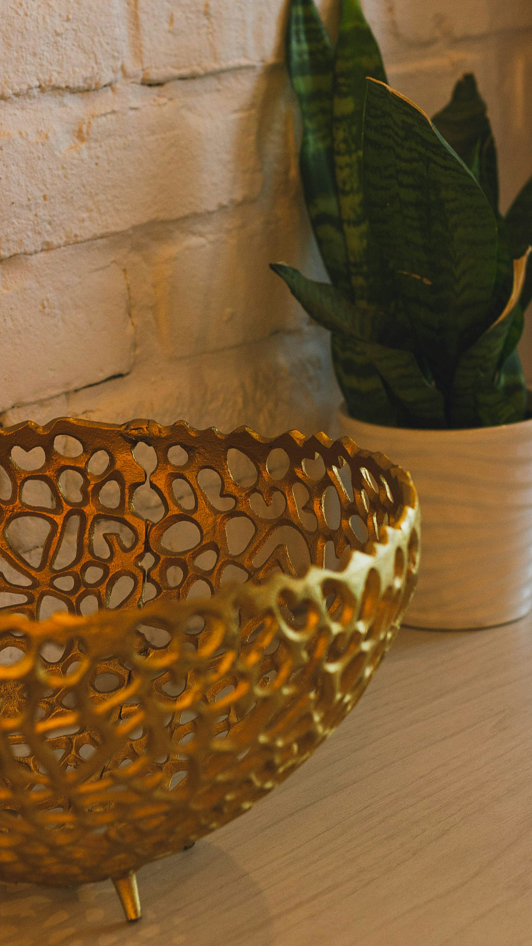 gold bowl, potted plant, table, still life, interior design, home decor, golden bowl, plant pot, tabletop, closeup, minimalist, elegant, luxury, natural elements, golden