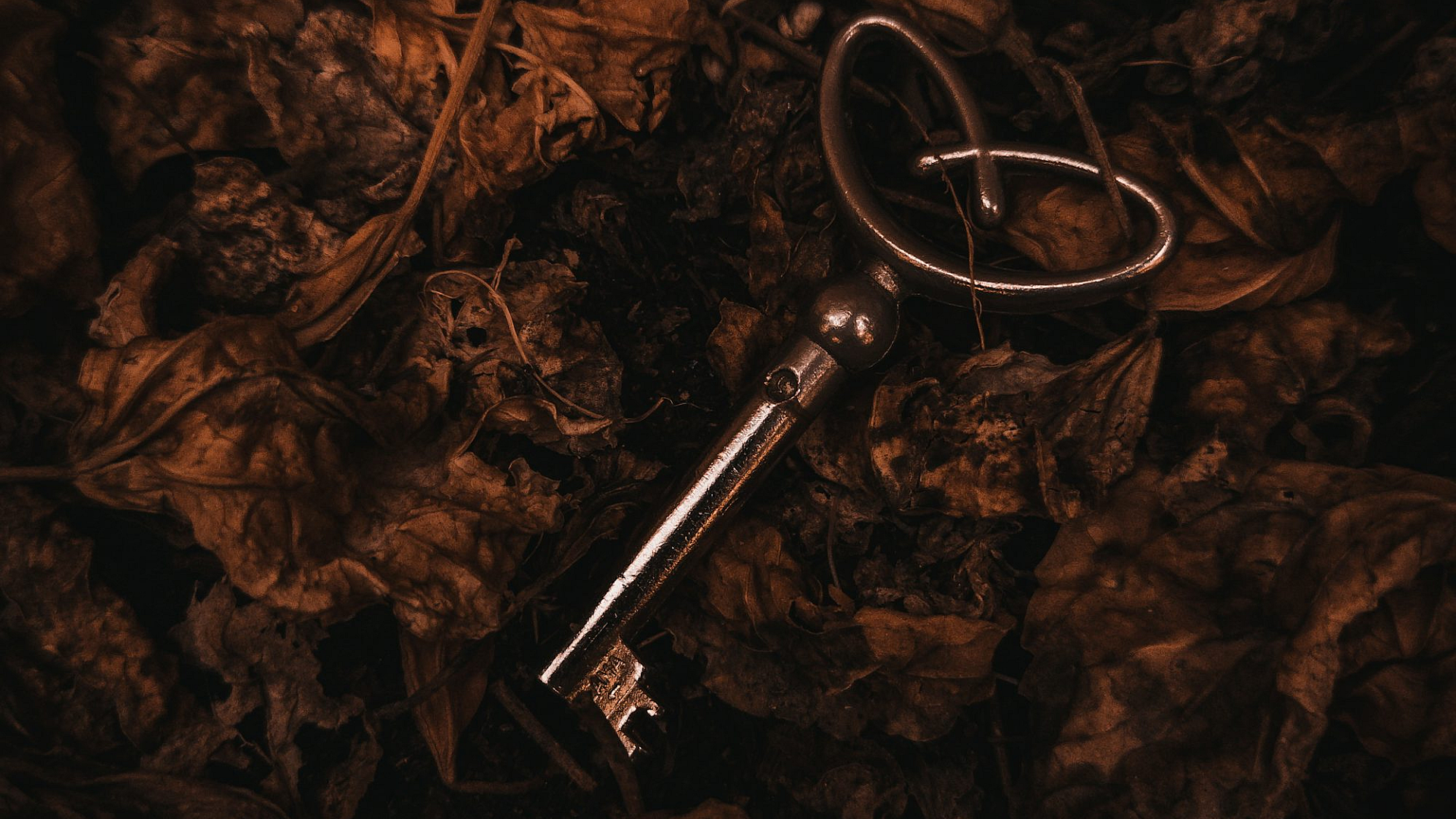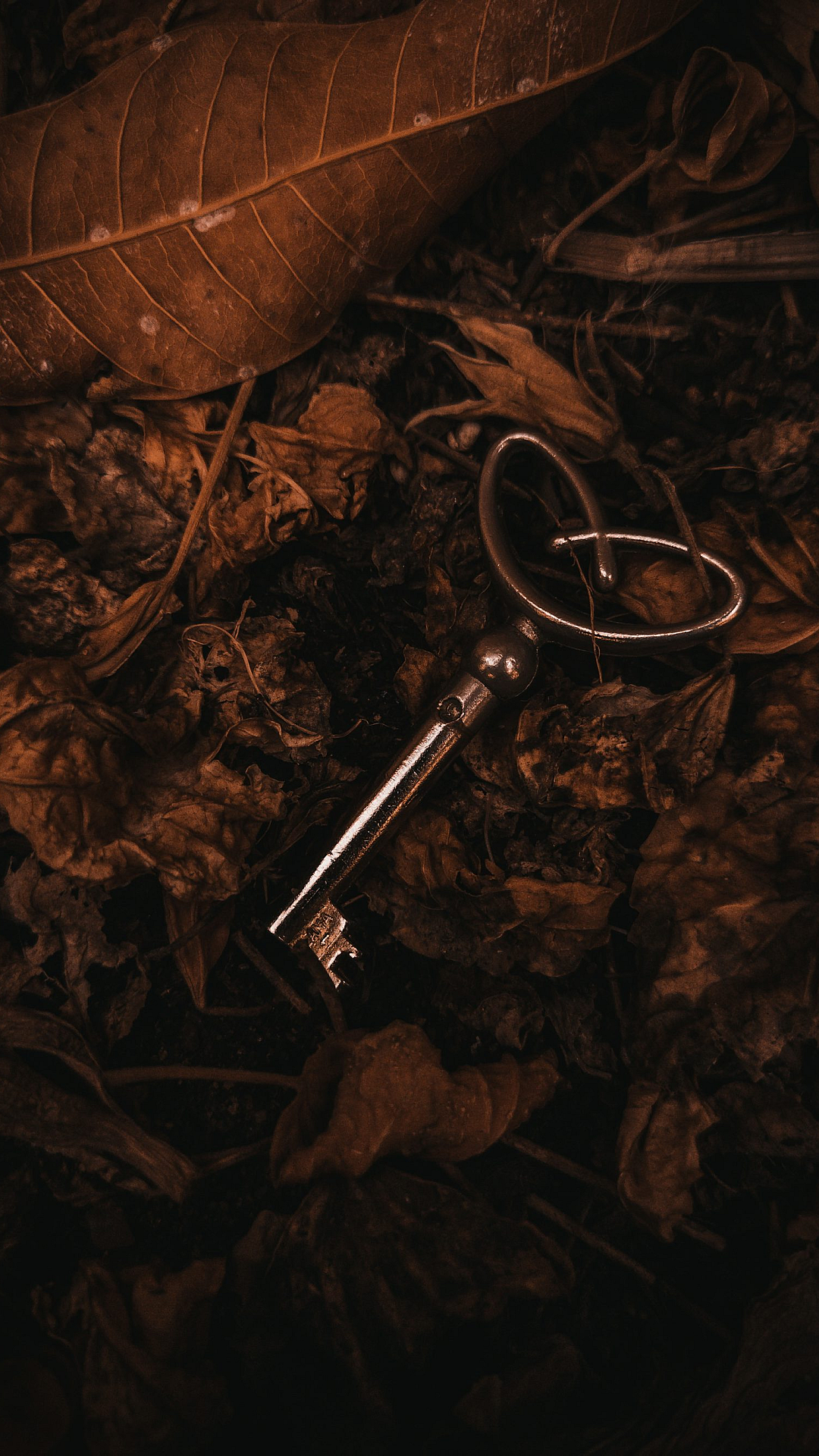 key, leaves, ground, autumn, fall, nature, foliage, leaf litter, earth, outdoor, rustic, vintage, secret, mystery, hidden