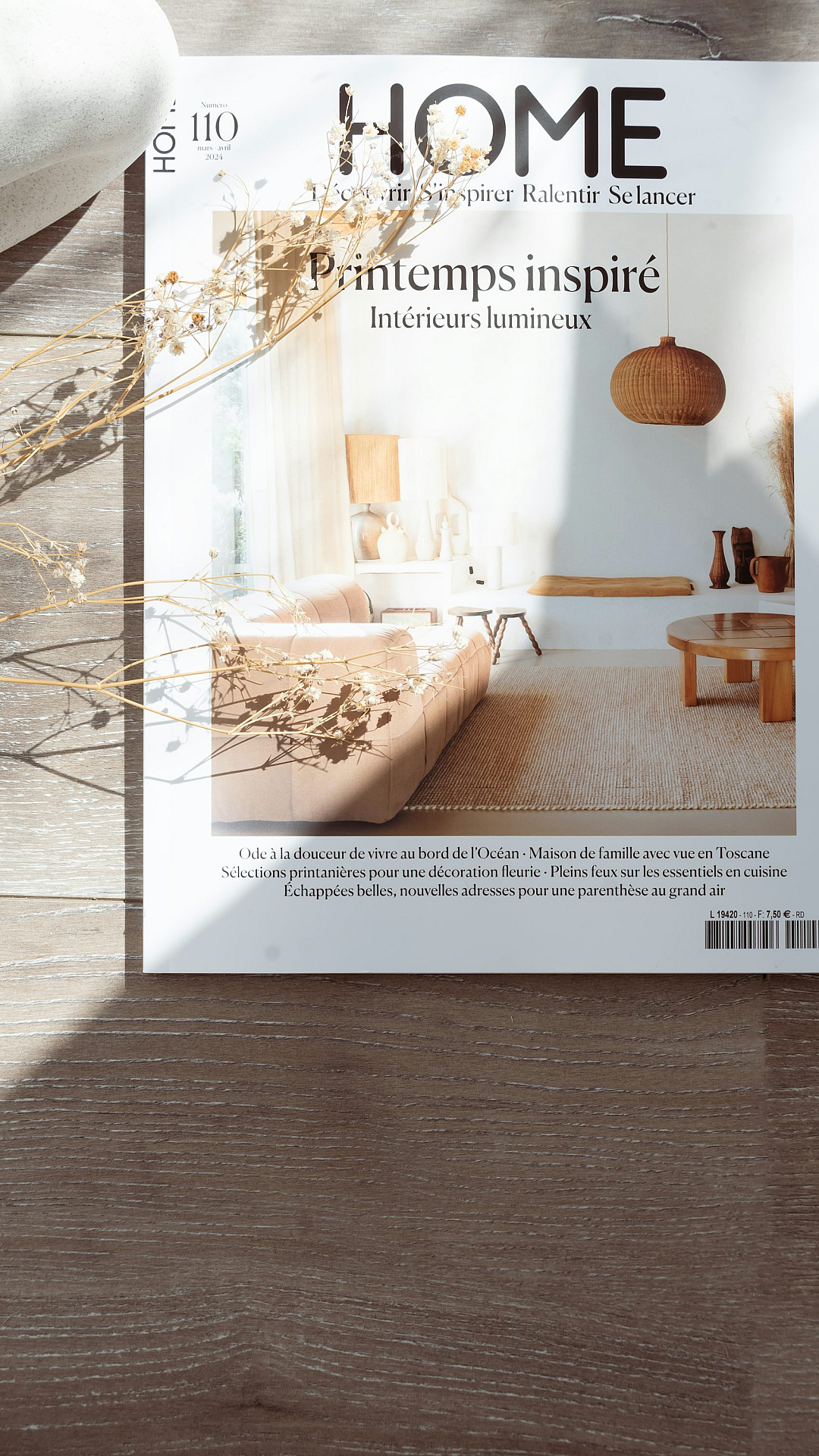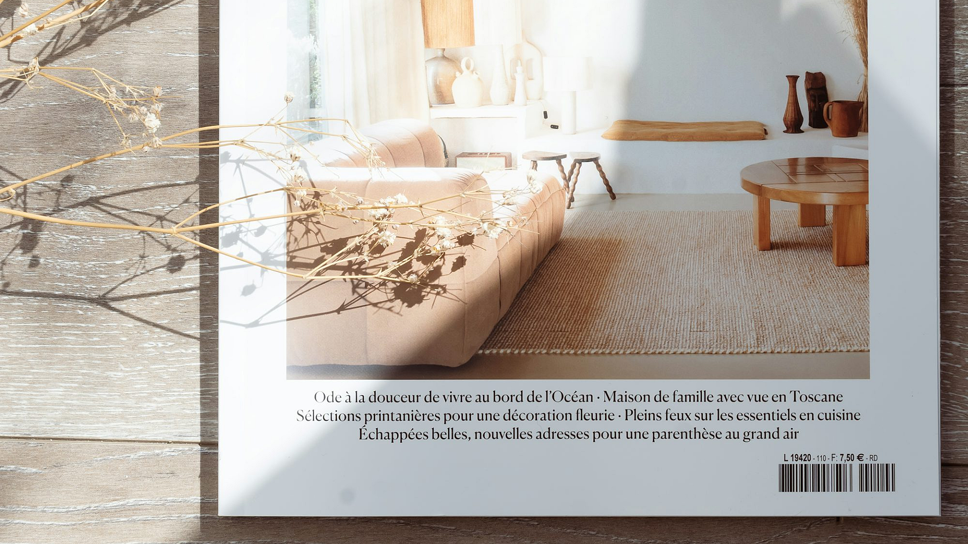 The focus is on the texture of the wood and the subtle details of the magazine cover. The lighting is soft and even, creating a gentle mood. The overall effect is one of serenity and quiet contemplation.