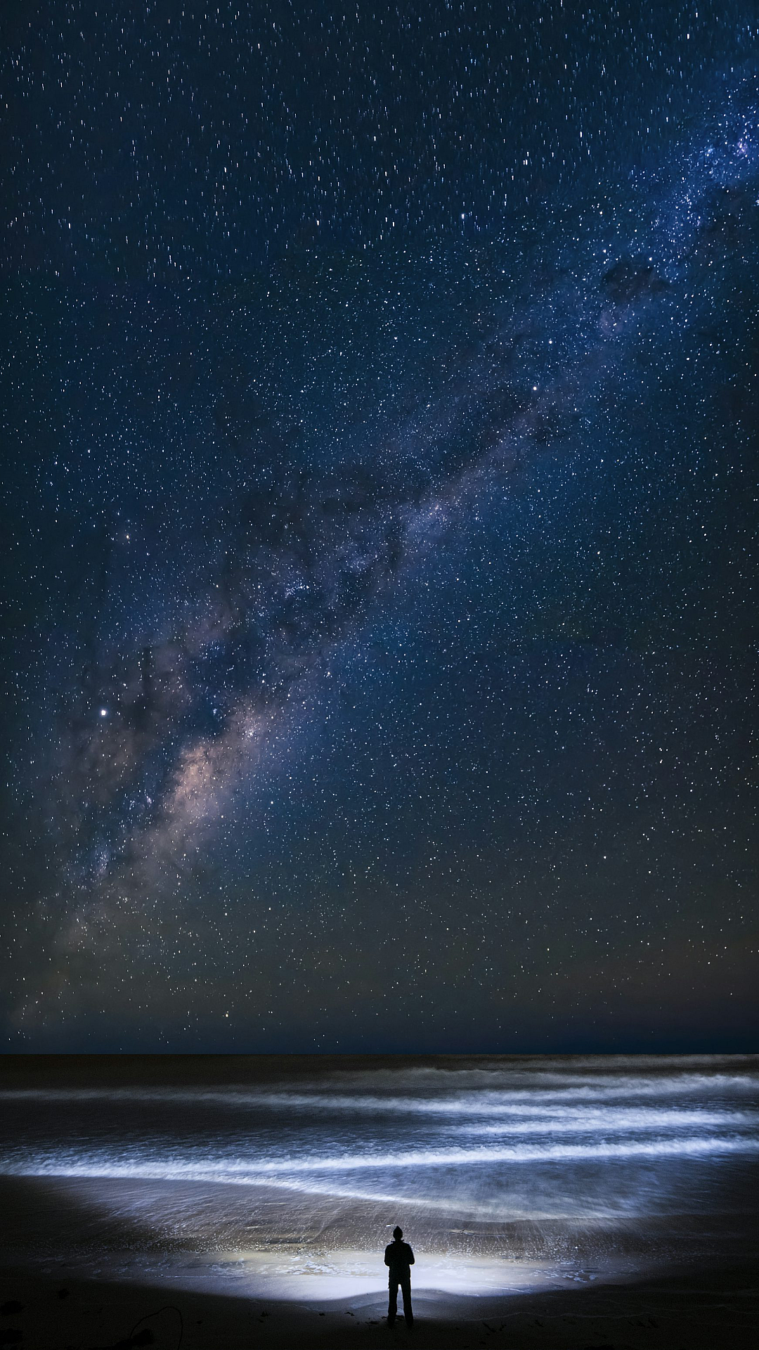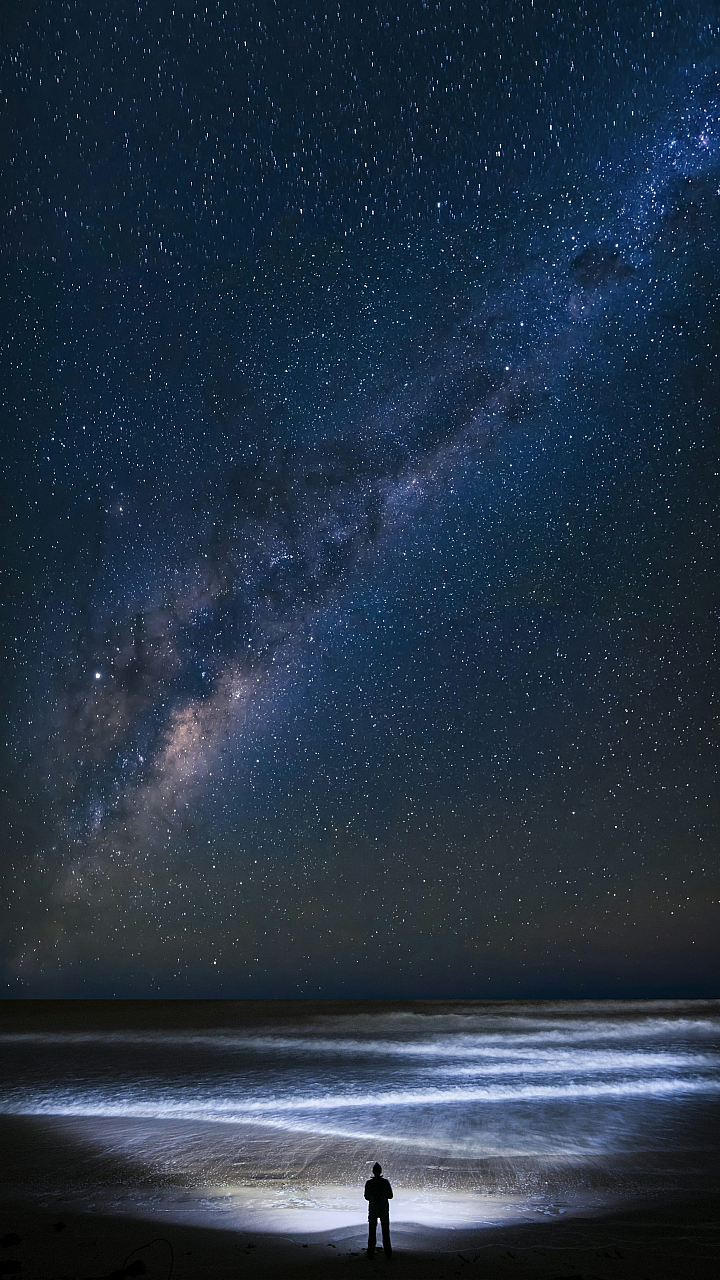 Keywords: night sky, starry night, beach, ocean, man, silhouette, alone, solitude, peaceful, serene, dark, mysterious, landscape, nature, wallpaper