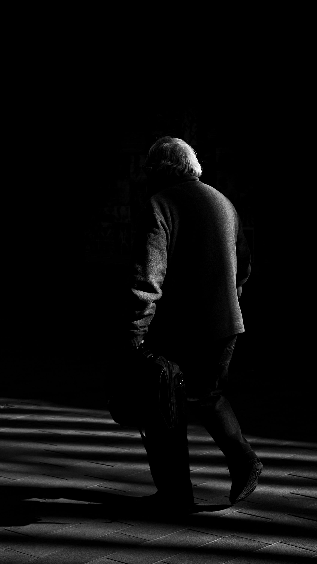This wallpaper features a solitary figure, a man, traversing a path engulfed in darkness. The scene is mysterious and evokes a sense of loneliness. The image is characterized by strong shadows and a moody atmosphere, making it perfect for those seeking a contemplative or introspective backdrop for their devices.