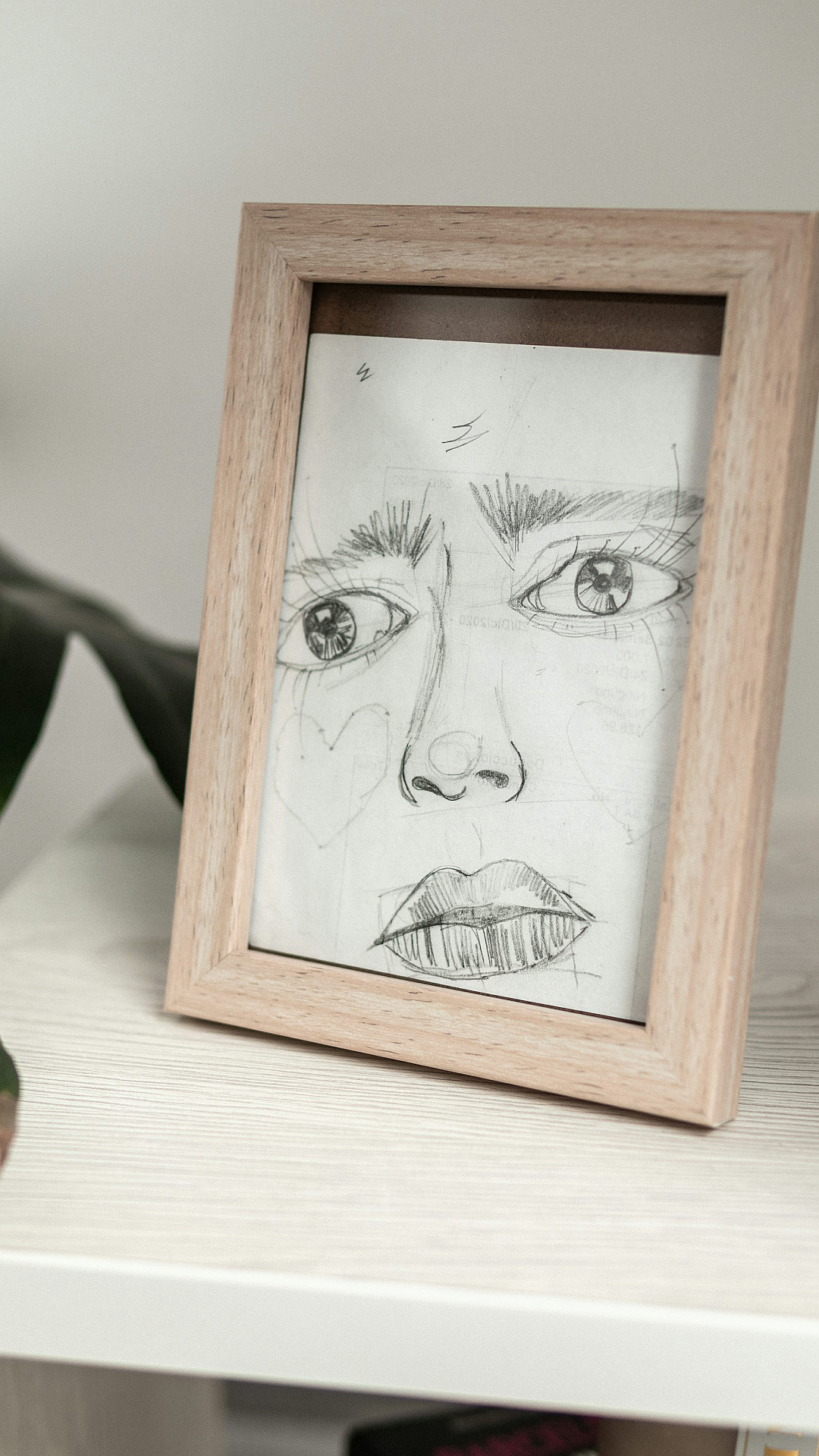 Keywords: picture frame, woman’s face, portrait, drawing, artwork, illustration, sketch, feminine, elegant, beautiful, art, aesthetic, wallpaper, background, image