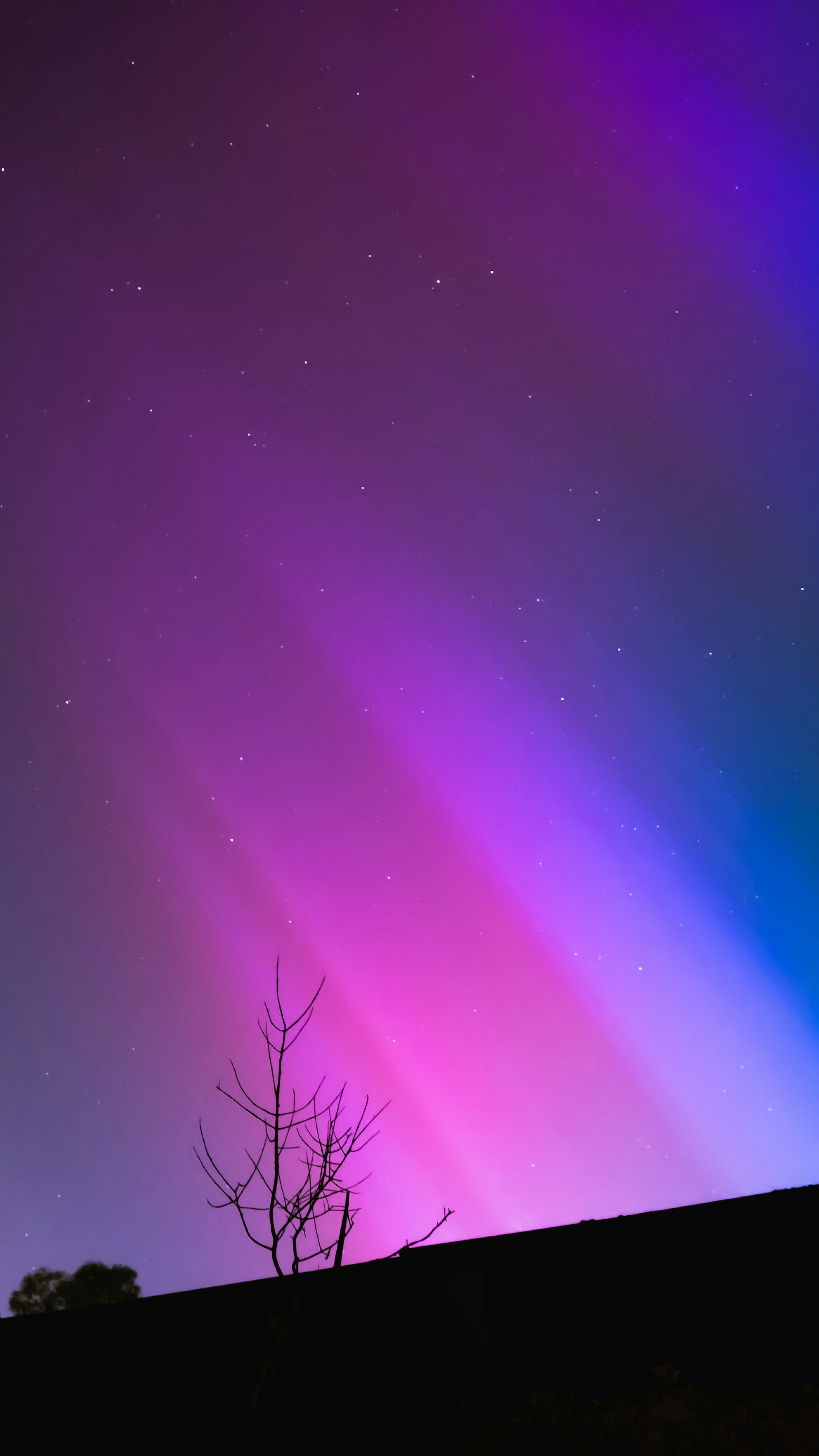 a purple and blue sky with a tree in the foreground