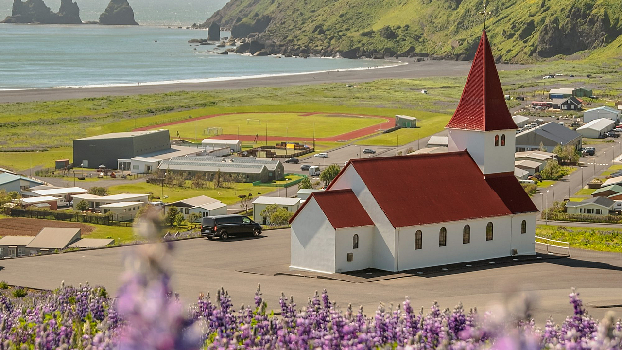 This wallpaper features a charming red and white building with a striking red roof. The scene is further enhanced by a profusion of purple flowers surrounding the structure, creating a vibrant and picturesque setting. The architectural details of the building are beautifully showcased, complemented by the rich color palette of the flowers and roof. The image offers a peaceful and aesthetically pleasing composition, perfect for various digital applications.