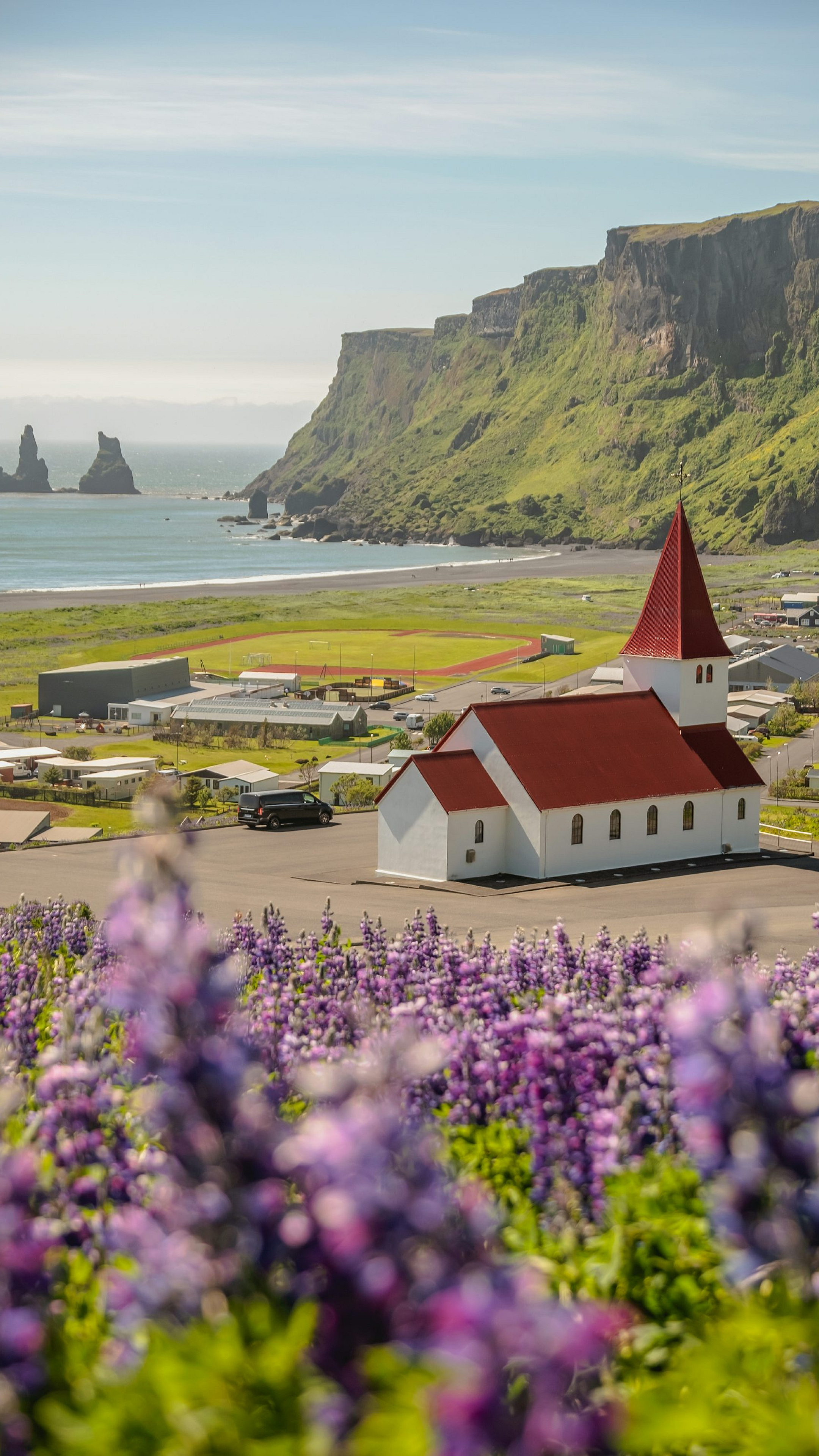 red and white building, red roof, purple flowers, building, architecture, house, home, floral, flowers, purple, red, white, vibrant, colorful, scenery, landscape