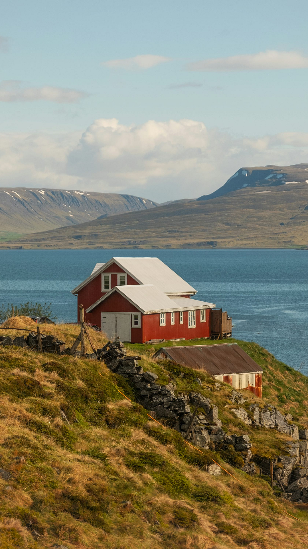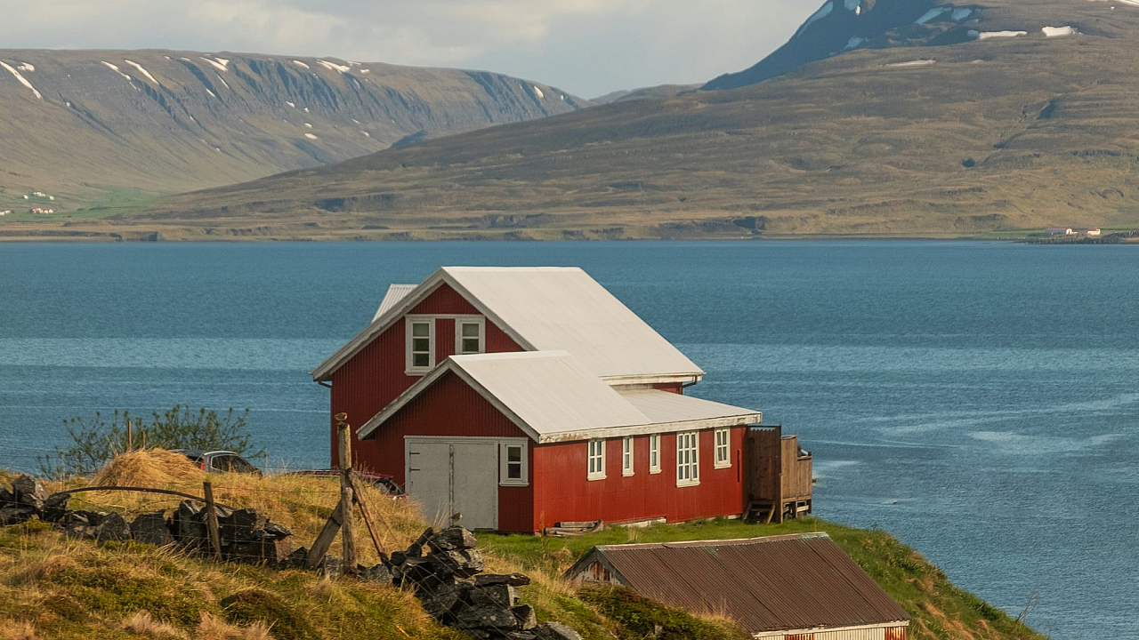 red house, house, red building, hill, hillside, water, ocean, sea, lake, river, coastal, seaside, landscape, scenery, architecture