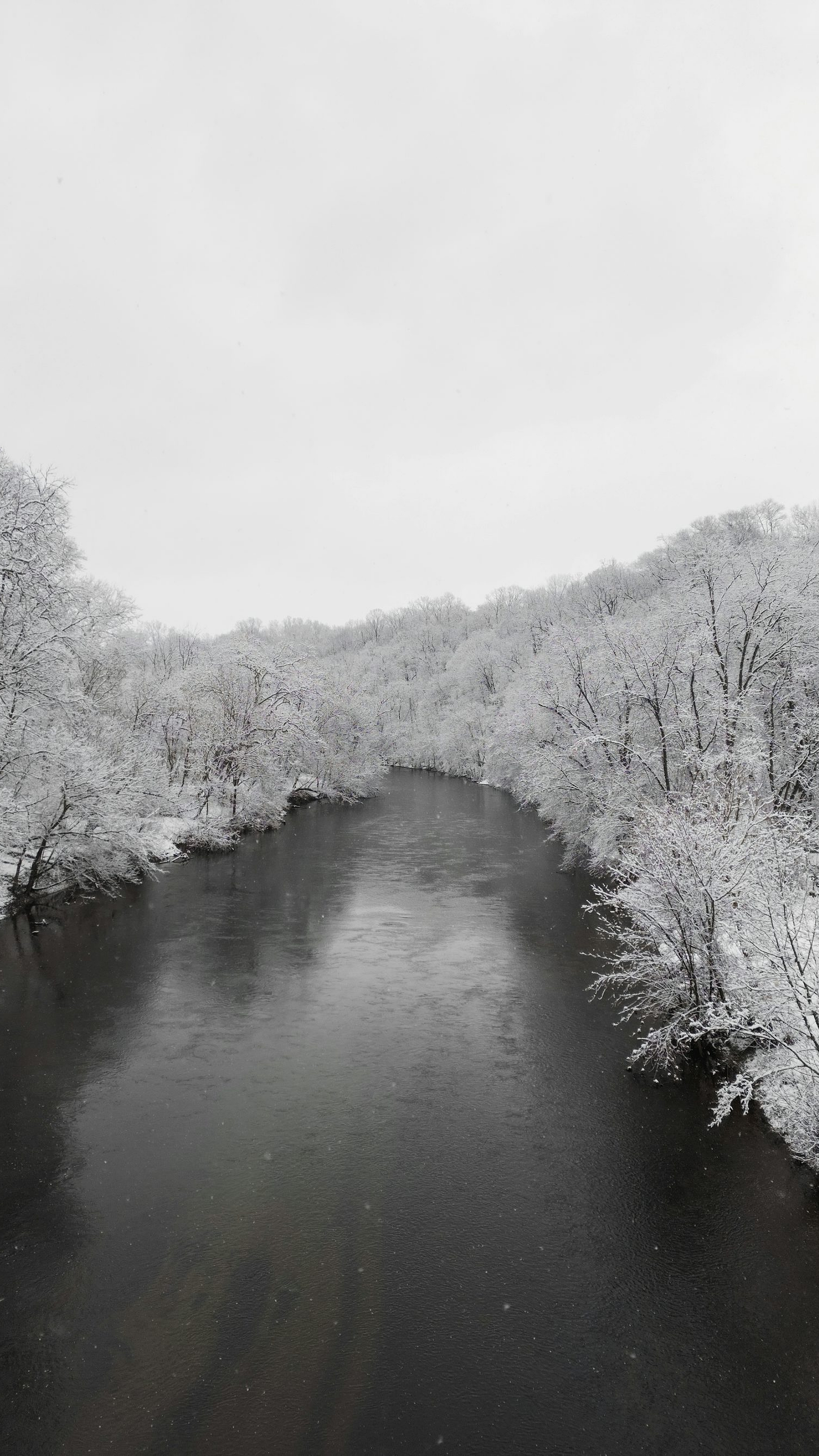 The intricate details of the landscape are clearly visible, from the delicate patterns in the snow to the textures of the trees and the glistening surface of the river. The color palette is primarily white and various shades of blue and grey, emphasizing the coldness and serenity of the winter setting. This wallpaper is perfect for those seeking a calming and aesthetically pleasing image to brighten their digital devices.