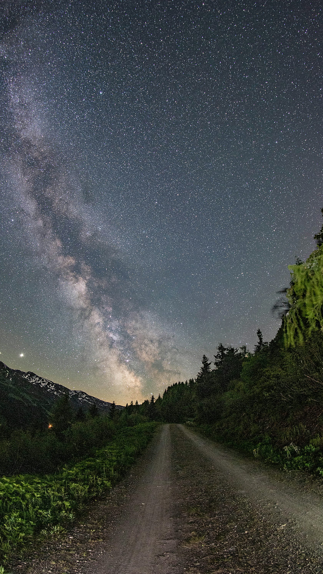 road, trees, stars, night sky, landscape, scenic, nature, pathway, astronomy, celestial, night, dark, avenue, country road, starscape