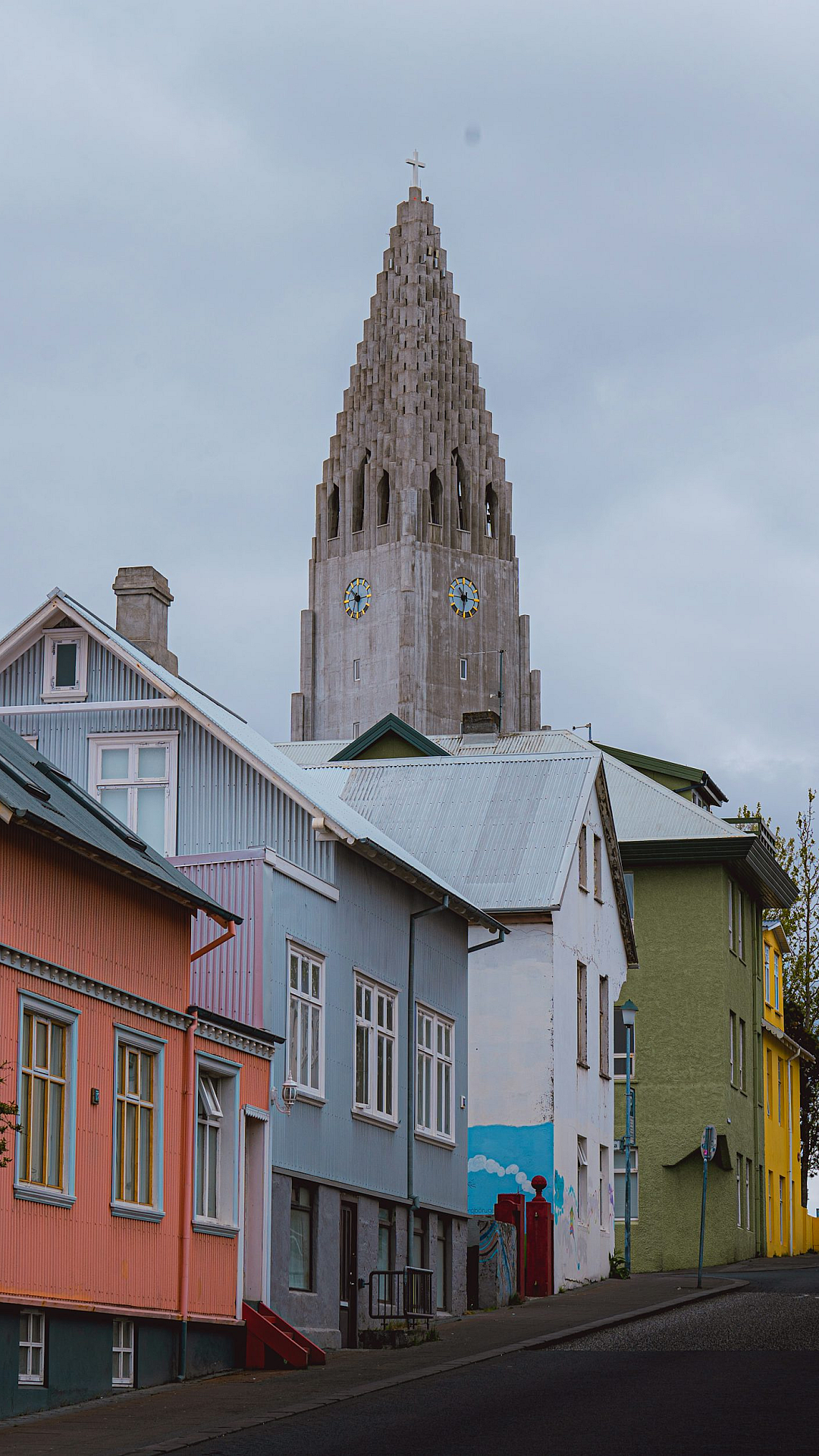 Keywords: row of houses, houses, homes, dwellings, church, steeple, church steeple, architecture, buildings, village, town, cityscape, landscape, scenery, background, skyline