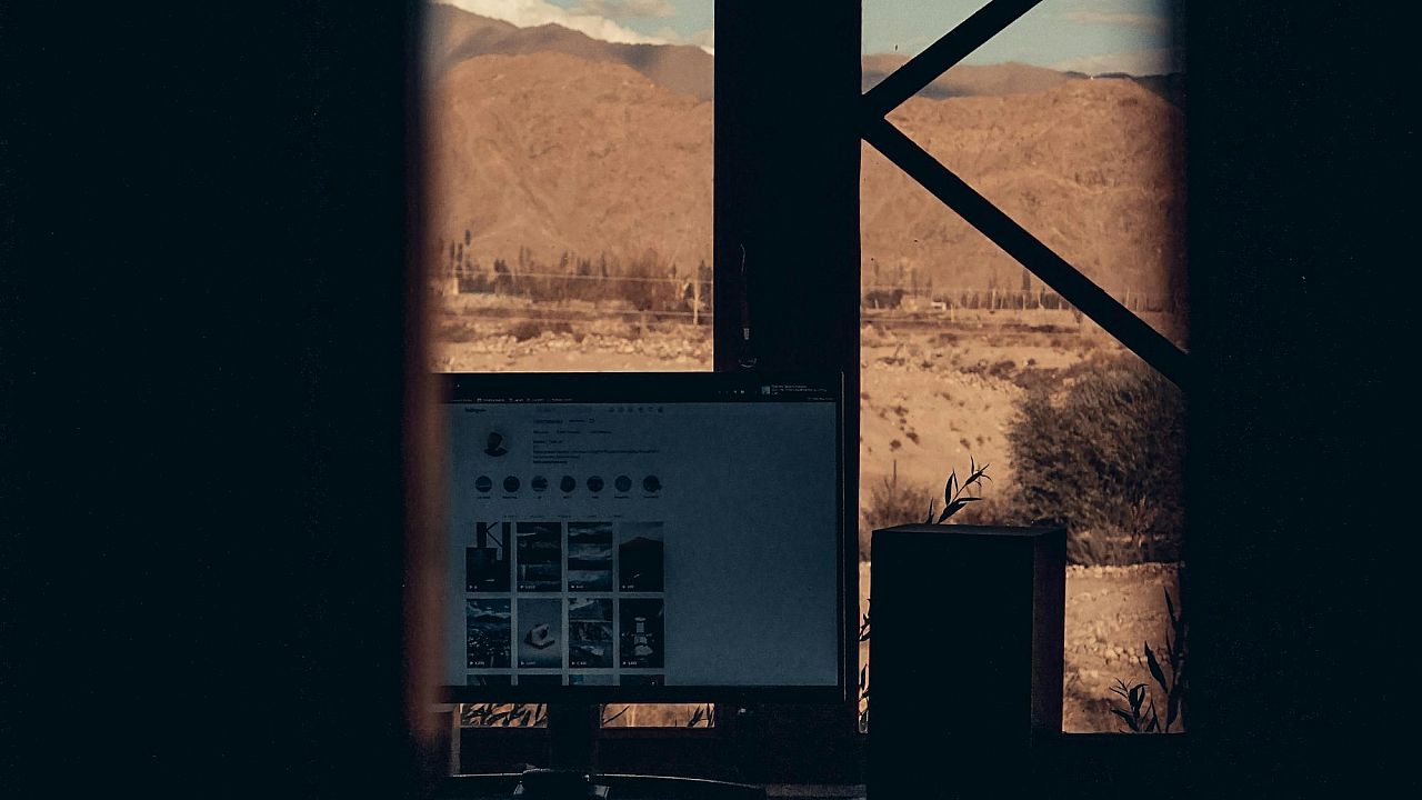 This stunning wallpaper features a captivating view seen through a window. The scene showcases a majestic mountain range dominating the backdrop, while a modern building is subtly integrated into the foreground, creating a beautiful juxtaposition of nature and urban elements. The image offers a serene and breathtaking panoramic view, perfect for those seeking a tranquil and inspiring atmosphere for their desktop or mobile device.