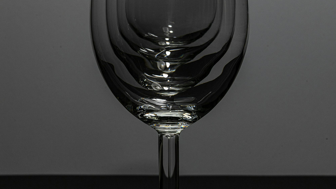 This wallpaper features a captivating image of a single wine glass elegantly placed on a table. The simplicity of the scene creates a sense of sophistication and tranquility. The focus is on the interplay of light and shadow on the glass, highlighting its delicate form and the subtle reflections of its surroundings. The clean lines of the table and the graceful curve of the glass create a visually pleasing composition, suitable for various home or office settings.