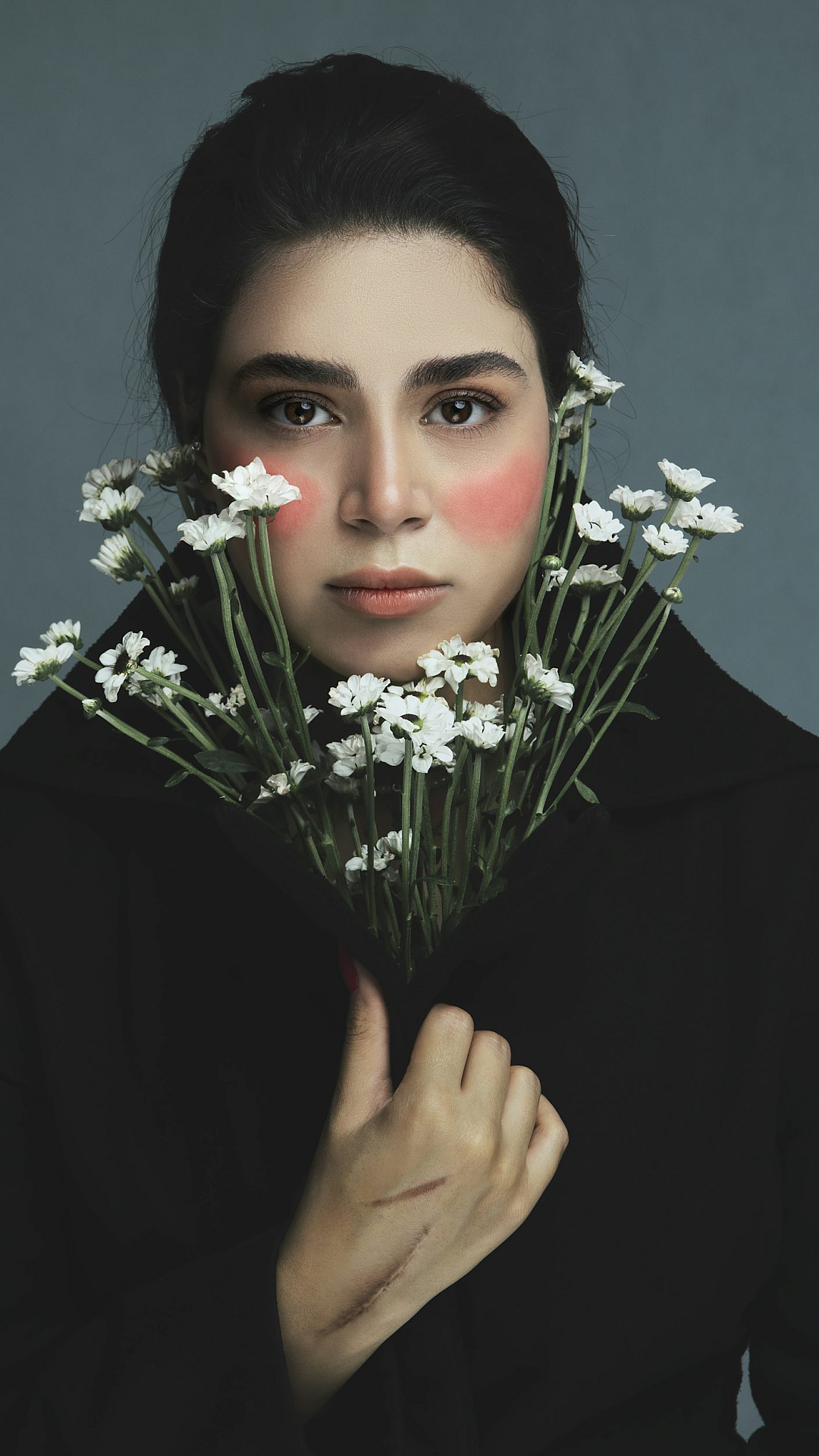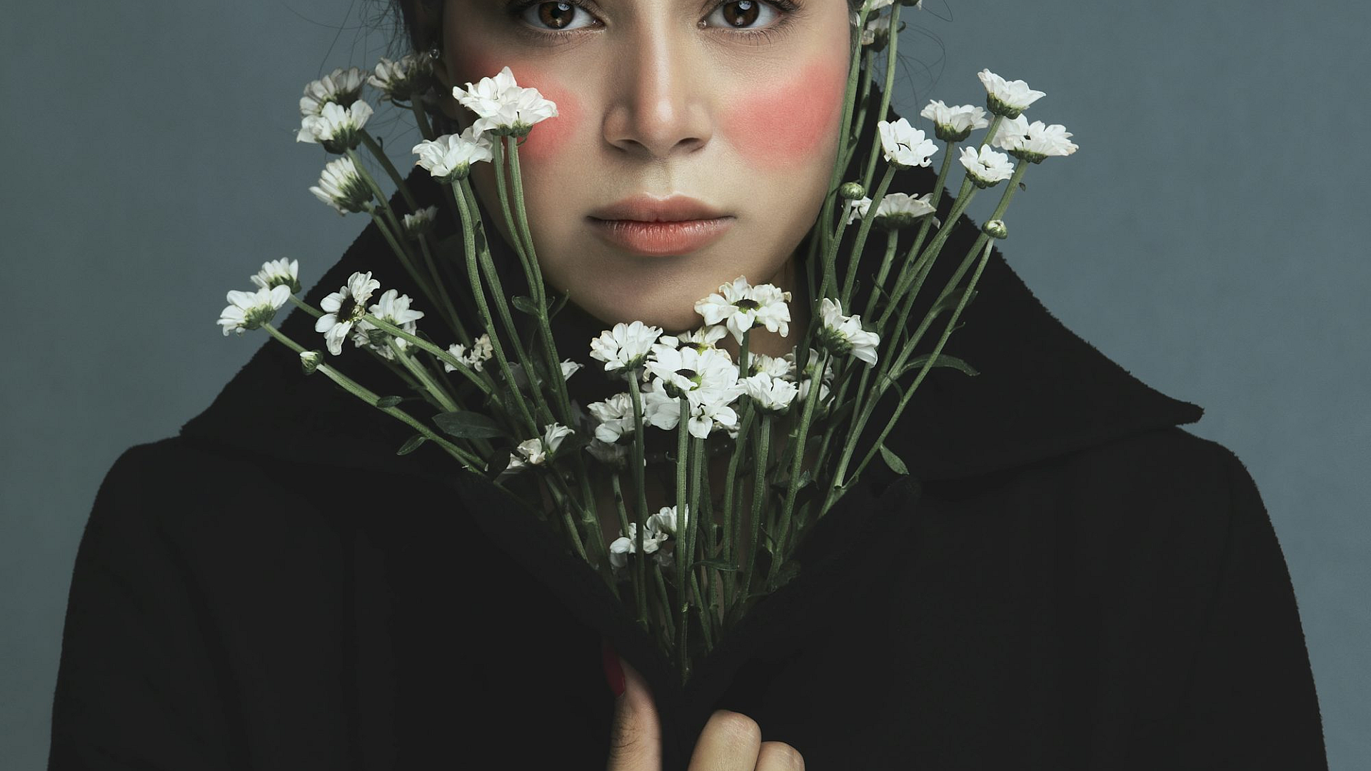 woman, flowers, bouquet, floral, face, hiding, concealed, portrait, feminine, delicate, pretty, beautiful, wallpaper, background, image, screen saver