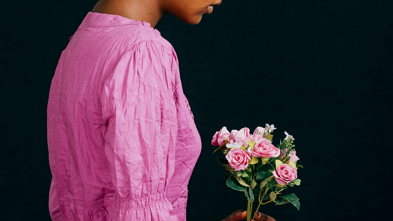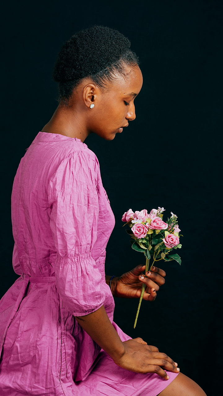 woman, pink dress, bouquet, flowers, floral, dress, gown, pink, rose, flowers, petals, woman, lady, girl, feminine, bouquet of flowers