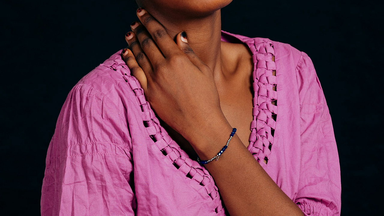 This wallpaper features a woman wearing a pink shirt, with her hands gently placed on her chest. The image offers a serene and thoughtful mood. The pink shirt is a striking element, adding a soft and calming tone to the overall composition. The woman’s pose conveys a sense of vulnerability and introspection.