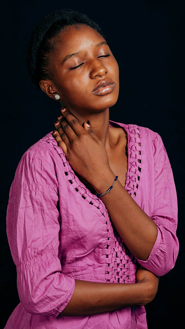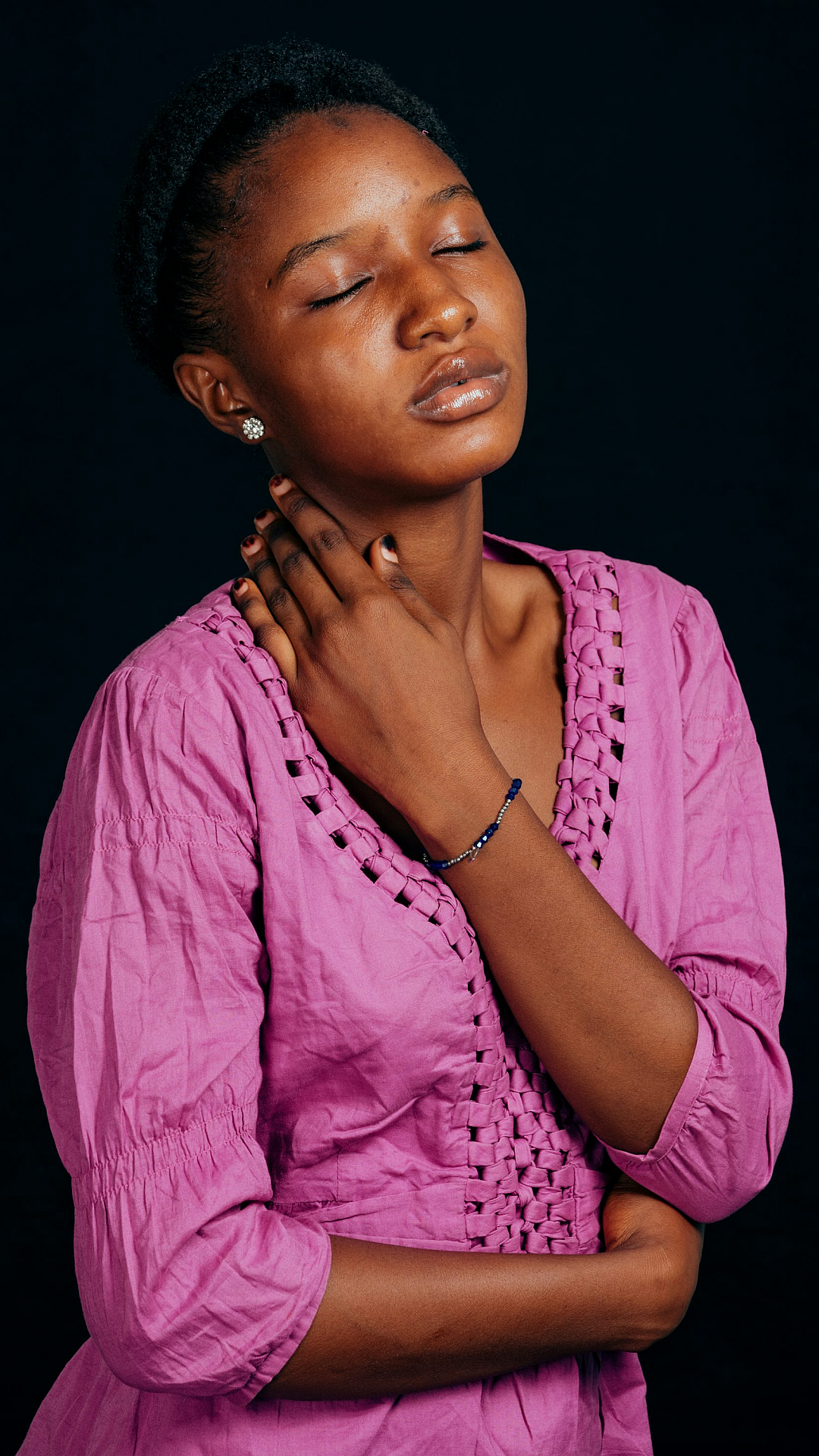 woman, pink shirt, hands on chest, female, girl, lady, woman portrait, pink clothing, apparel, attire, fashion, pose, gesture, expression, feminine