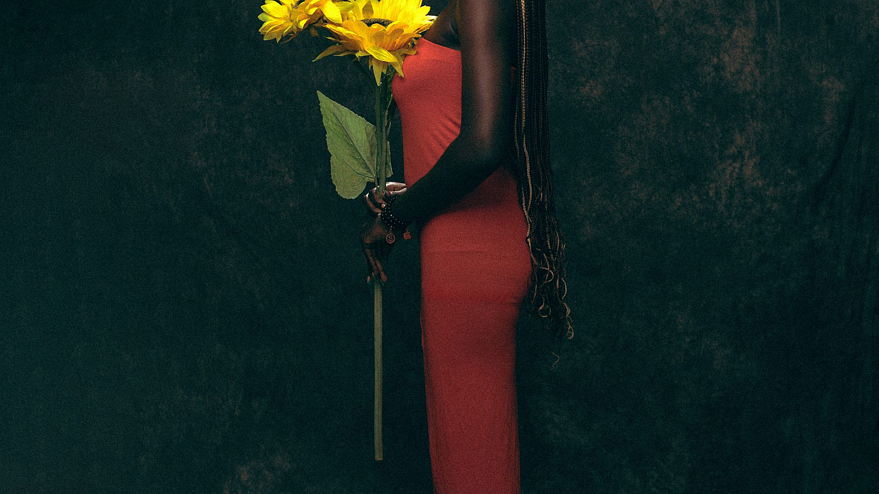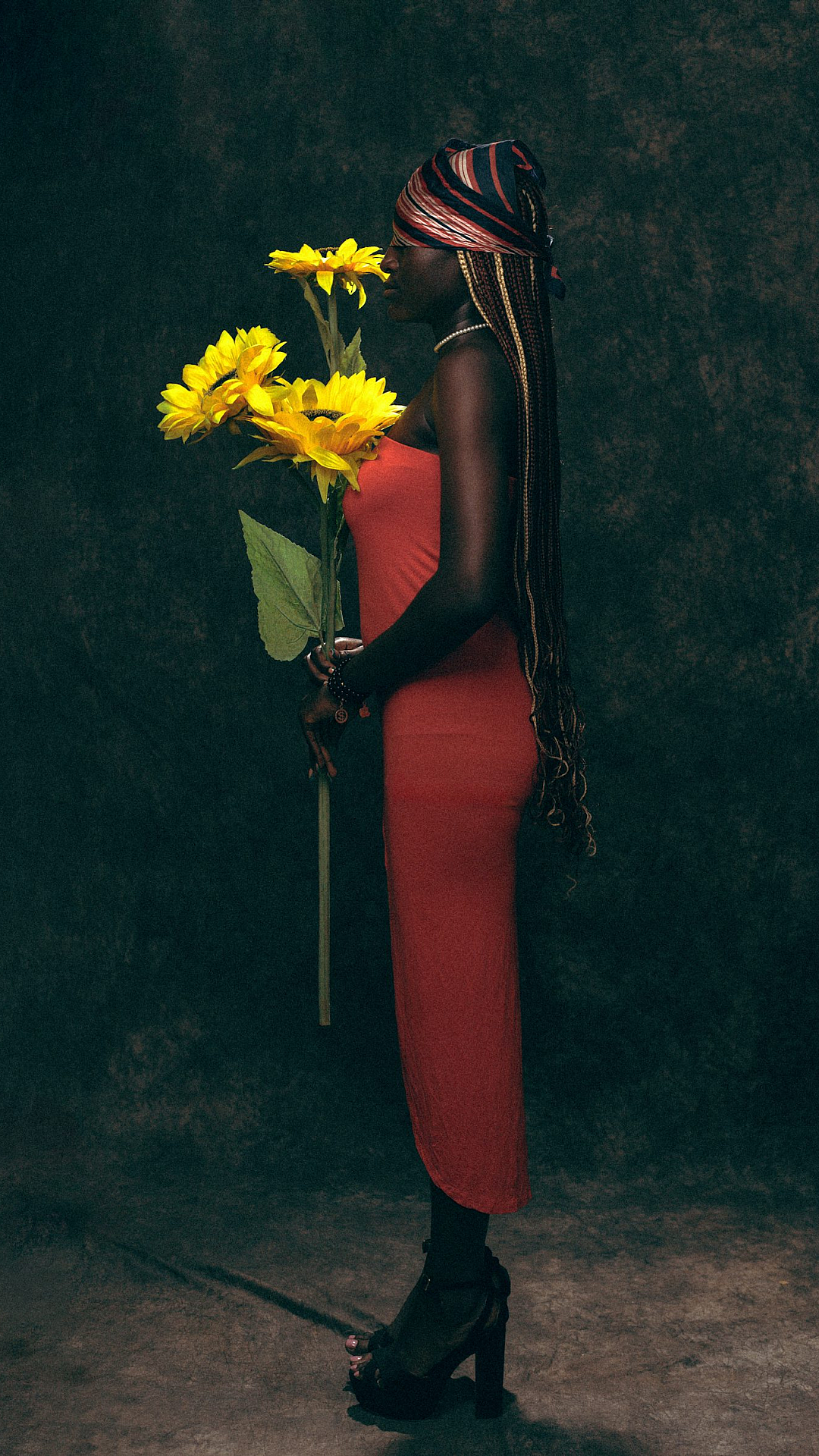 Wallpaper A Woman in a Red Dress Holding a Bouquet of Flowers