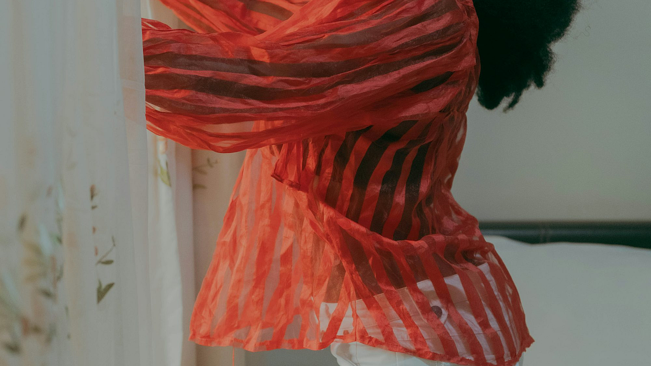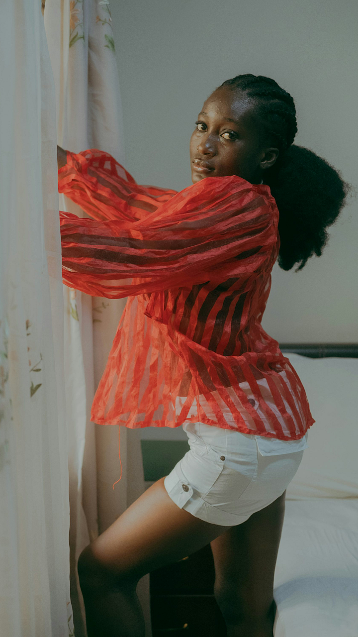 woman, female, girl, white shorts, red scarf, summer, fashion, style, outfit, clothing, apparel, red, white, casual, portrait