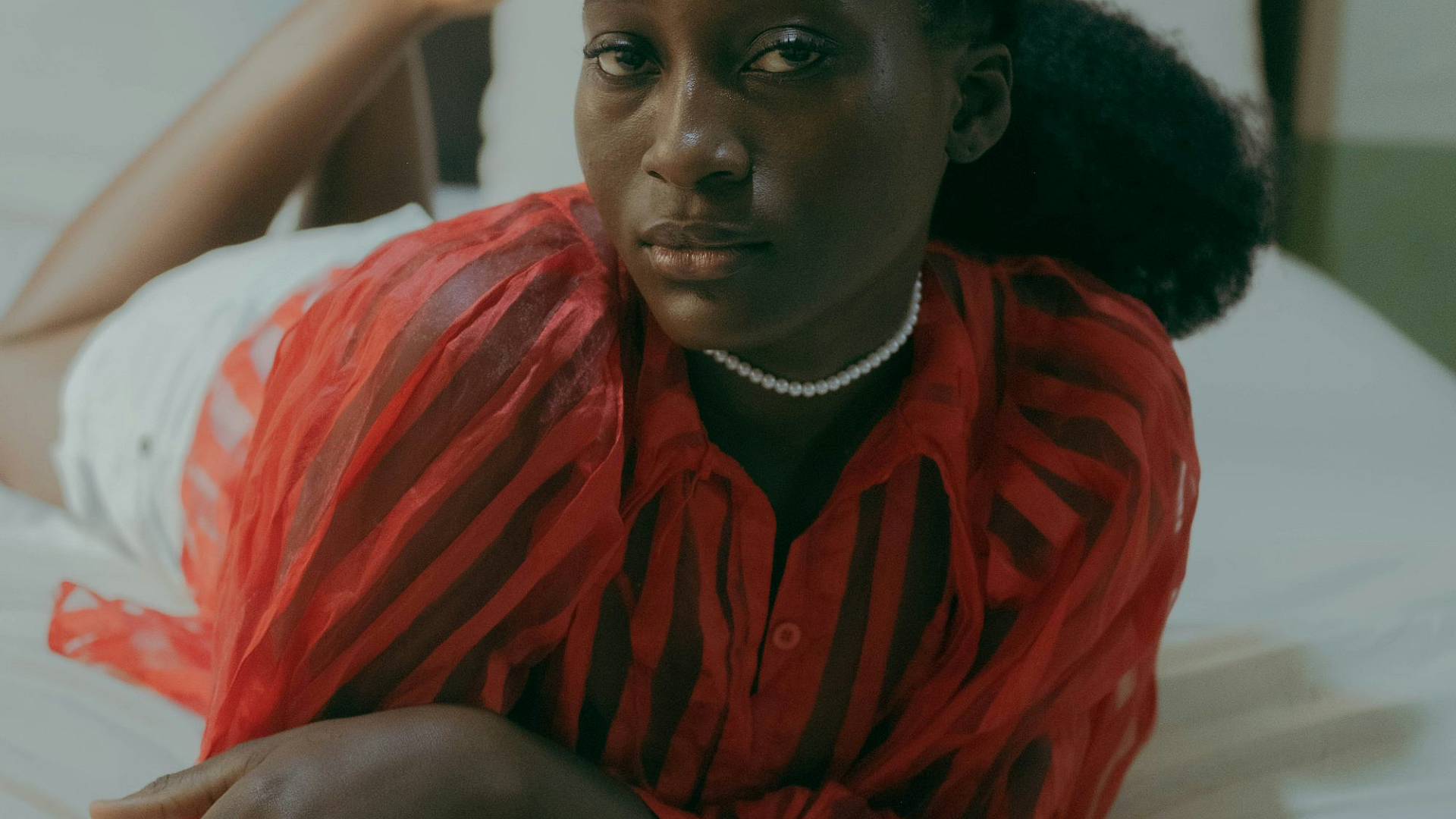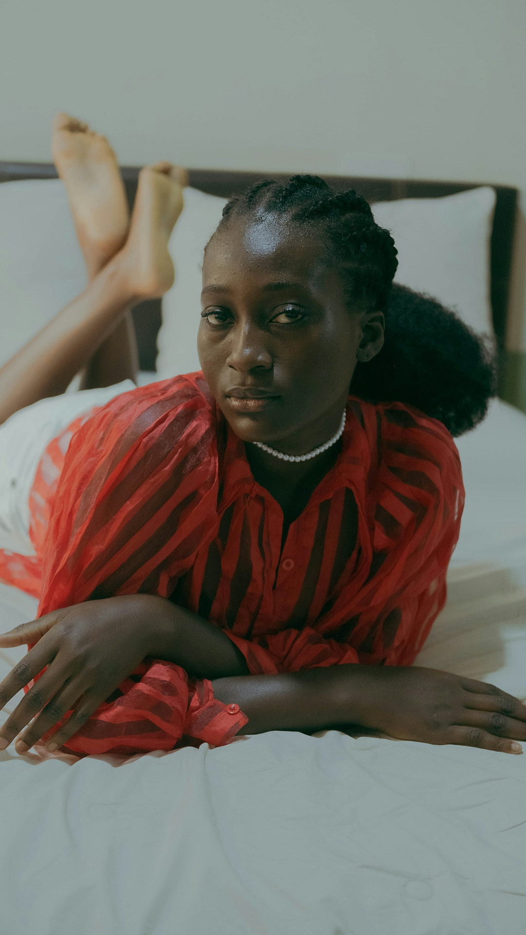 woman, red dress, bed, laying down, sleeping, resting, relaxing, bedroom, elegant, stylish, fashion, female, apparel, robe, indoors