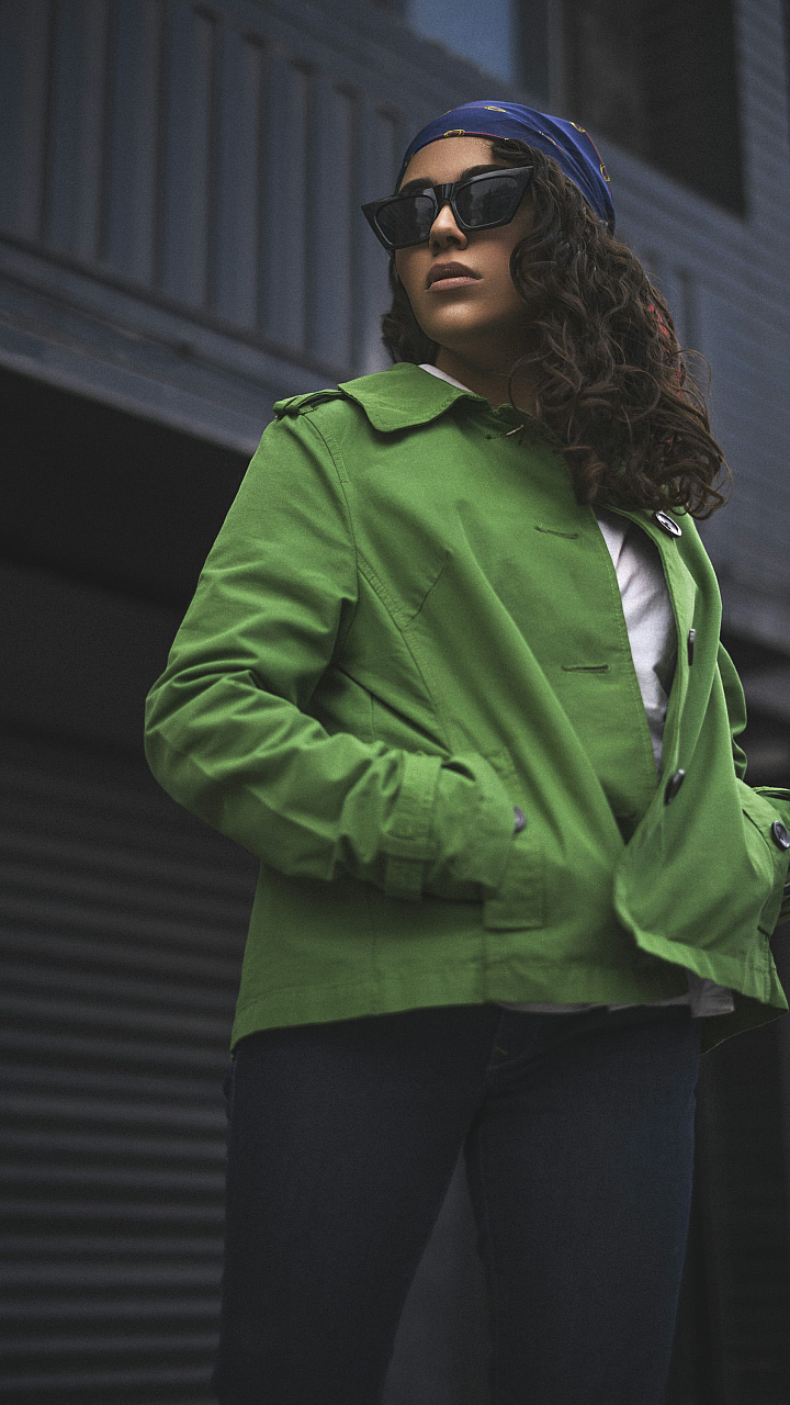 Keywords: woman, sunglasses, green jacket, female, fashion, style, outerwear, apparel, clothing, portrait, model, eyewear, green, outdoor, cool
