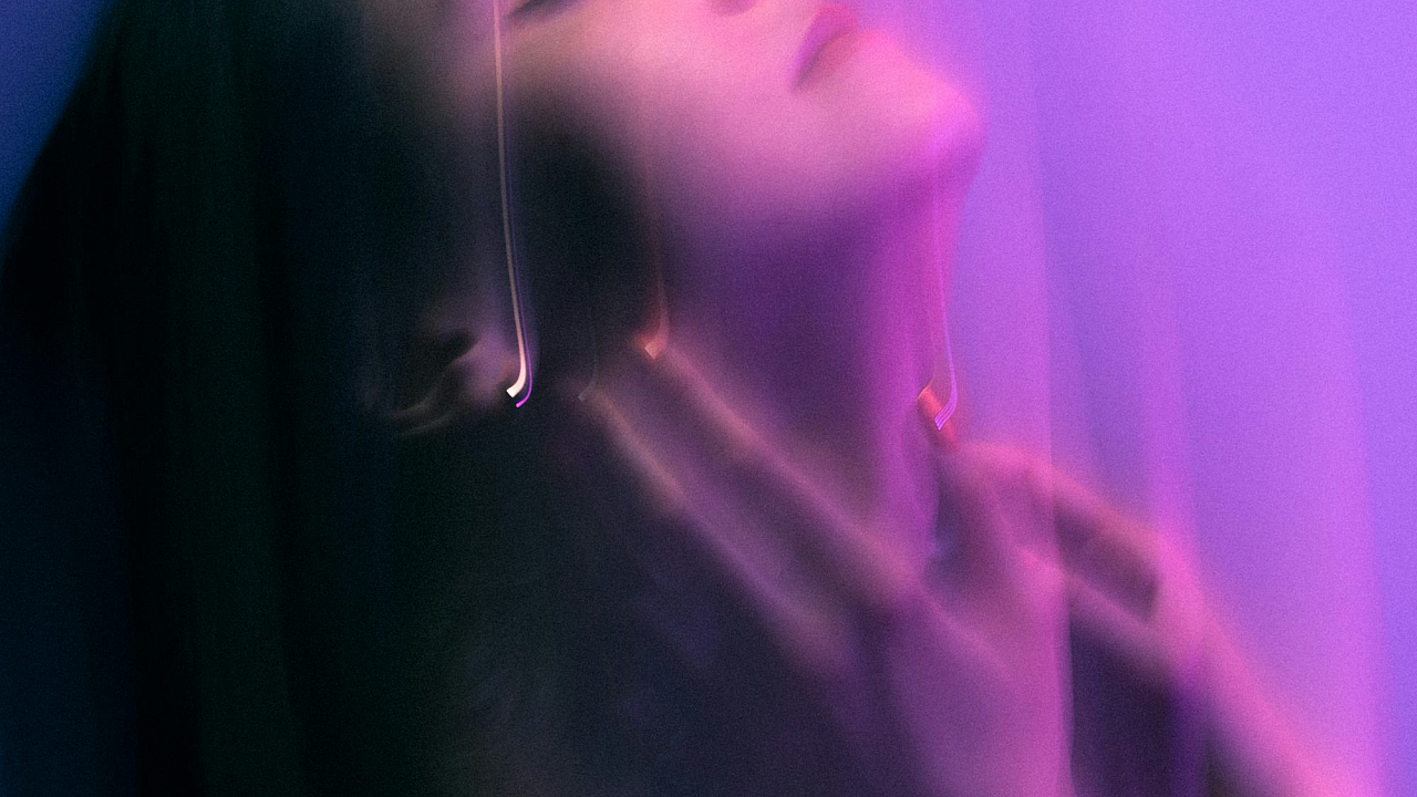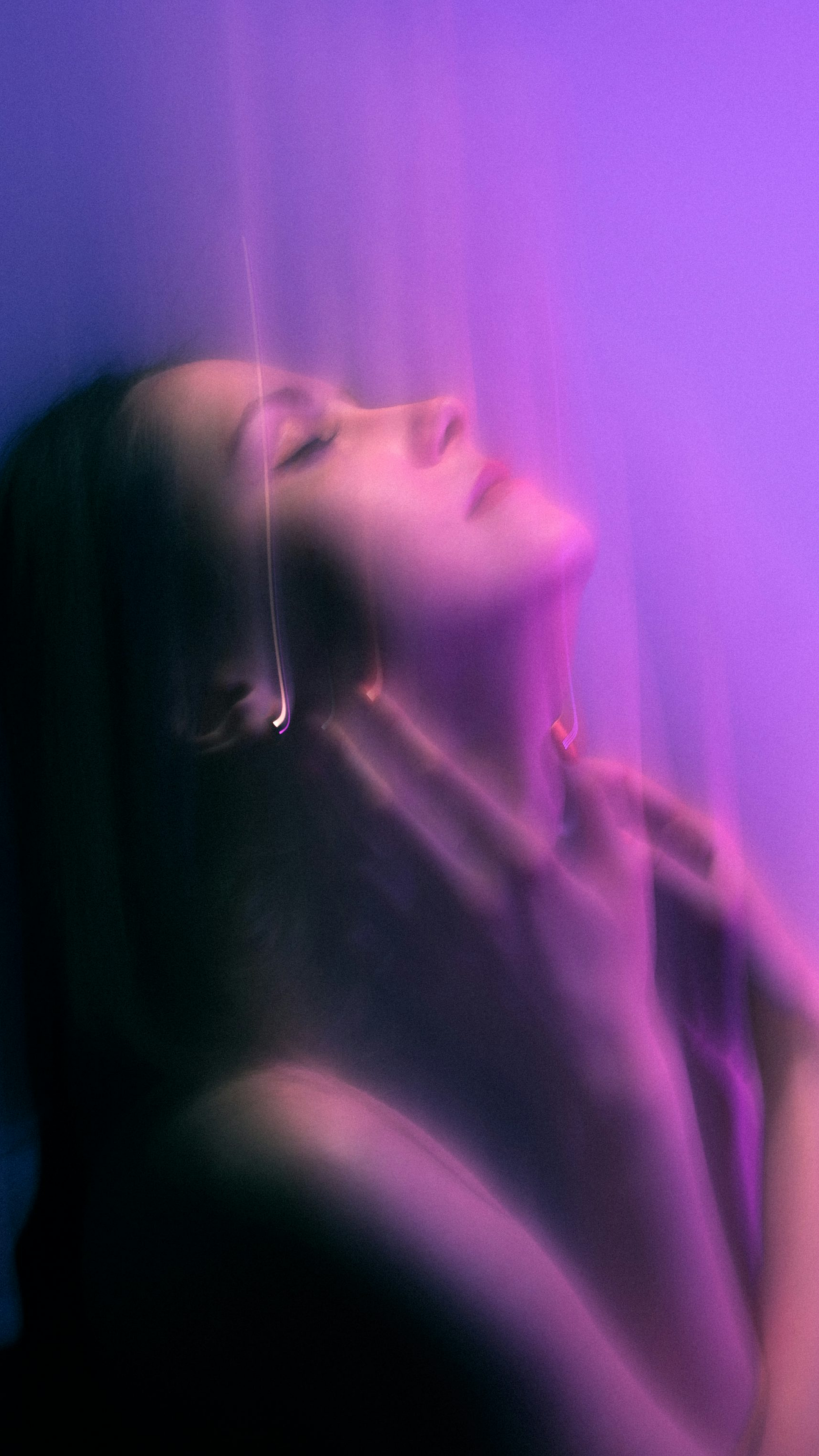 woman, eyes closed, purple background, serene, peaceful, calm, tranquil, purple, violet, lavender, magenta, female, portrait, minimalism, abstract