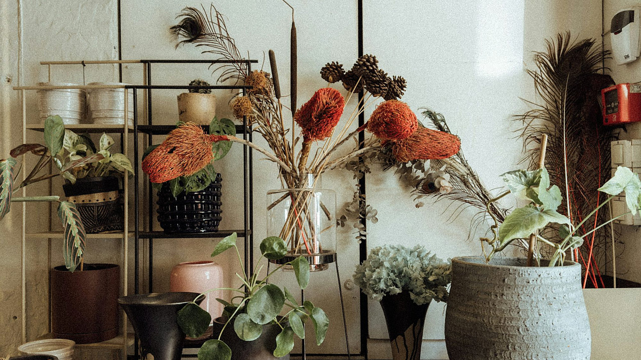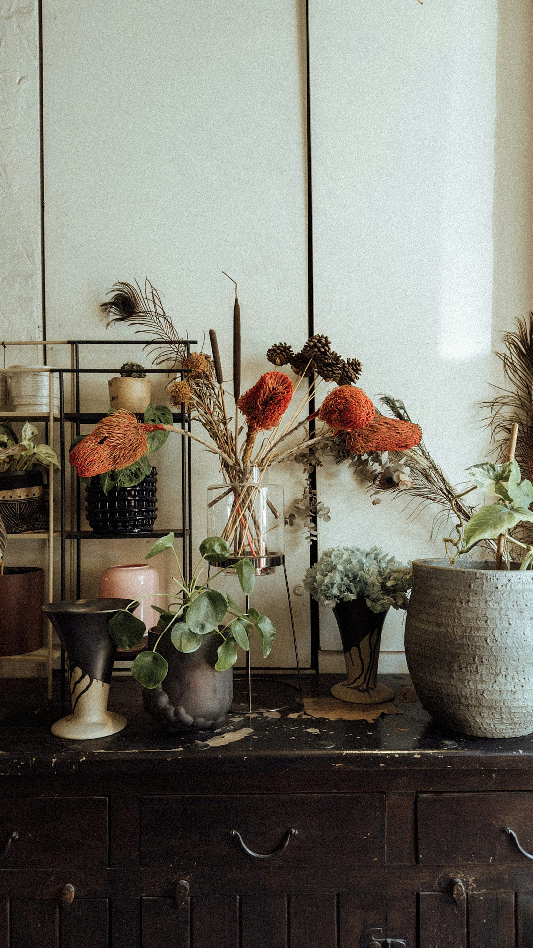 wooden dresser, dresser wallpaper, flower vases, floral arrangement, flowers, wooden furniture, rustic wallpaper, countryside wallpaper, home decor, interior design, vintage wallpaper, shabby chic, bouquet, still life, vase
