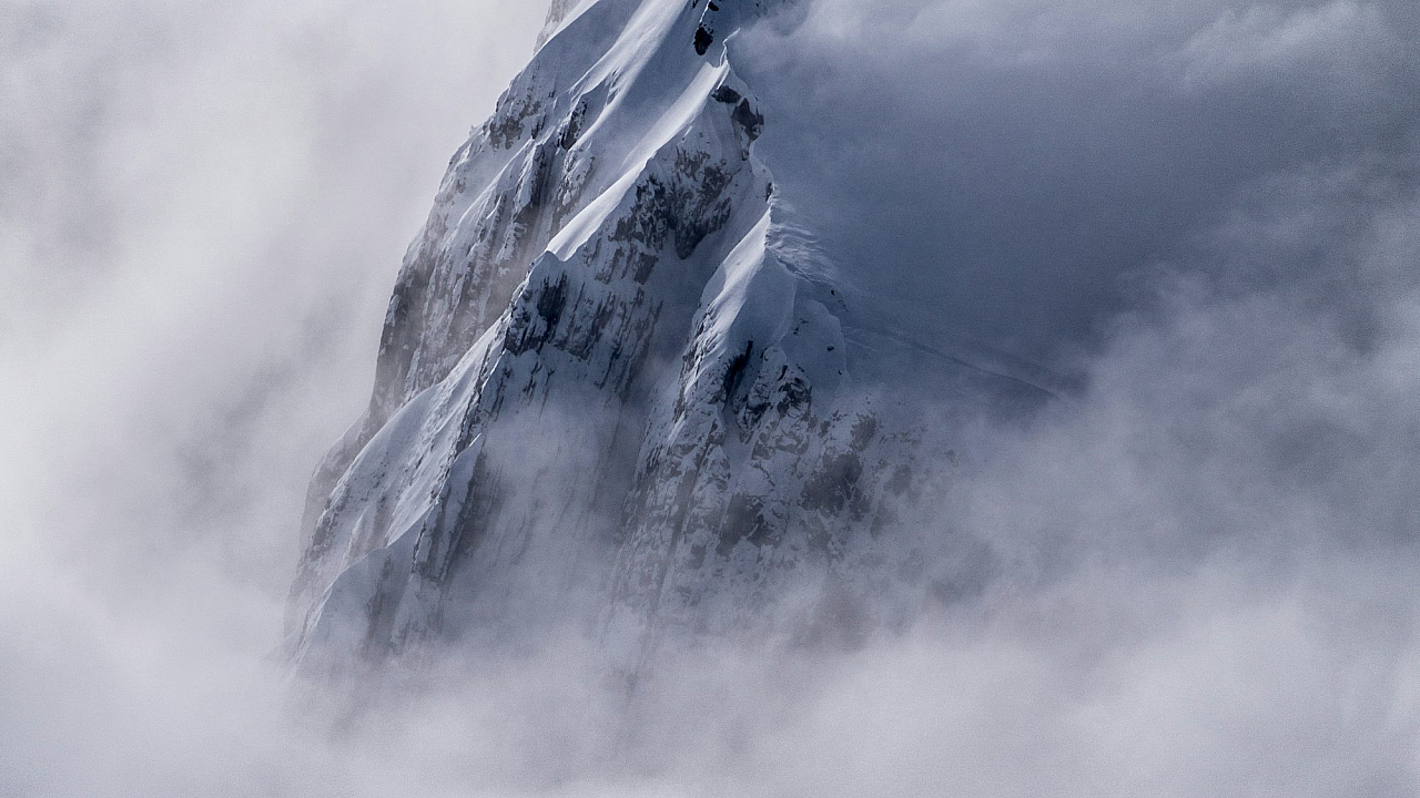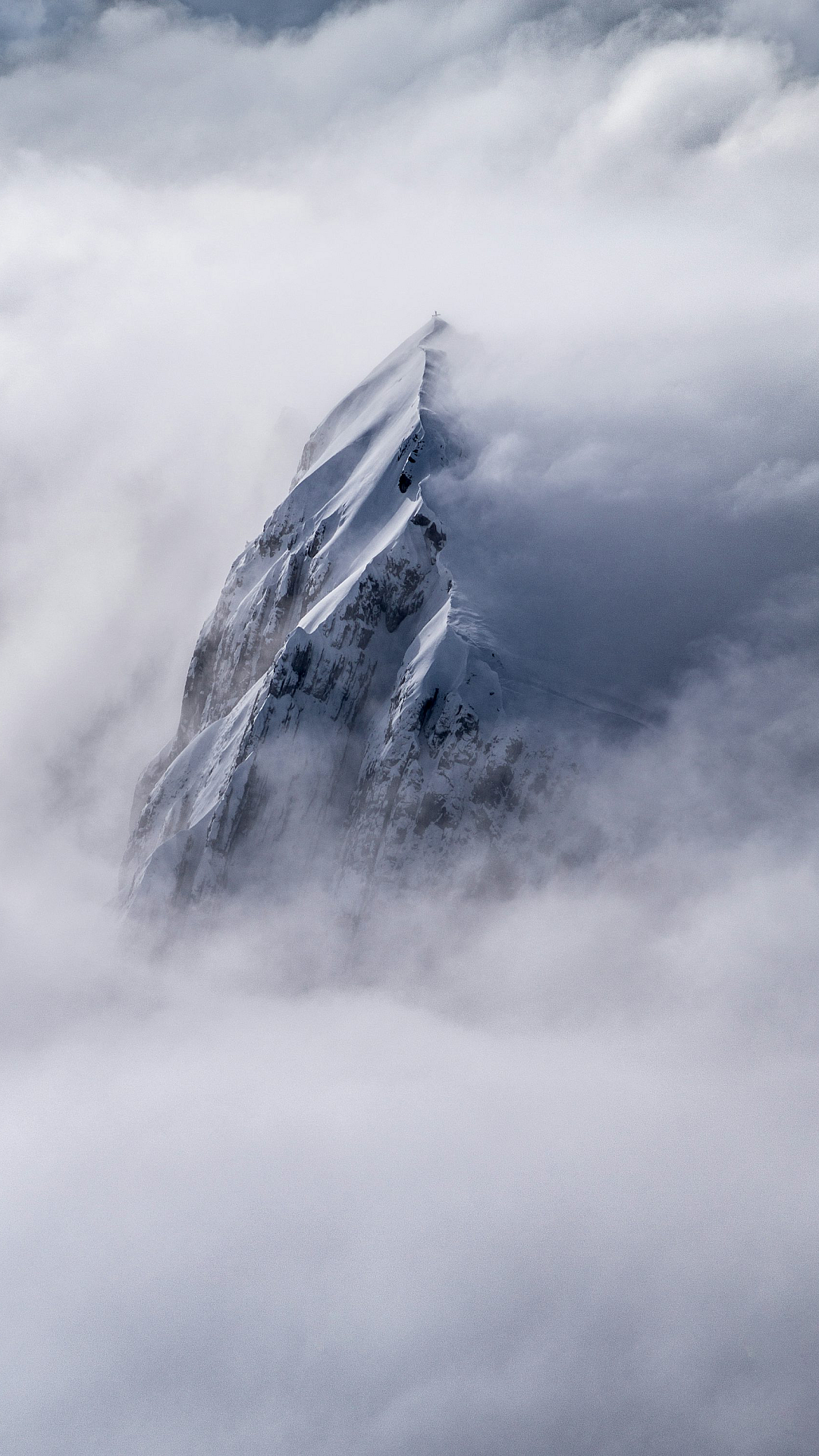 The image is rich in texture and detail, showcasing the intricate patterns of the snow and the ruggedness of the mountainous terrain. The various shades of white and gray further enhance the overall aesthetic appeal of the wallpaper, making it a visually captivating addition to any device.