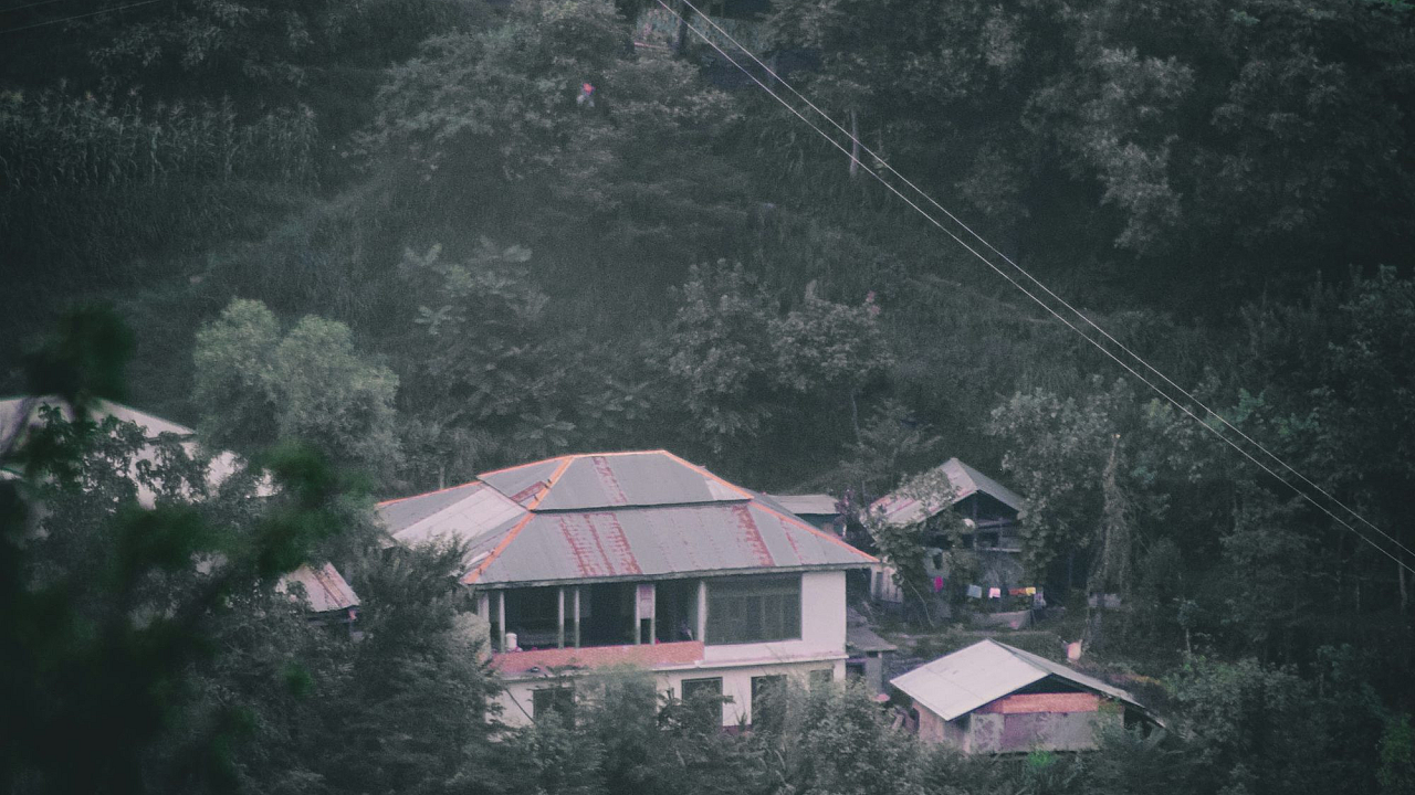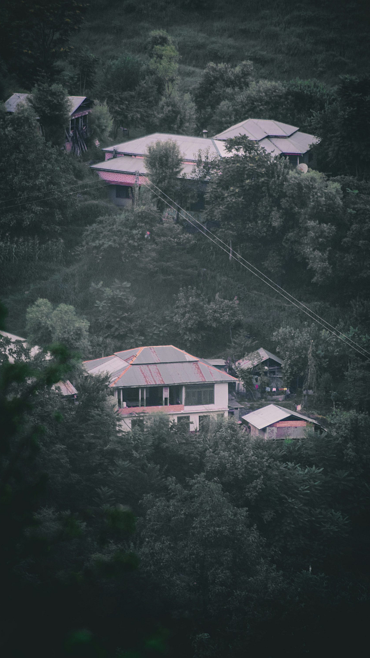 aerial view, house, trees, forest, woods, nature, landscape, scenery, home, residential, property, overhead, birds-eye view, canopy, green