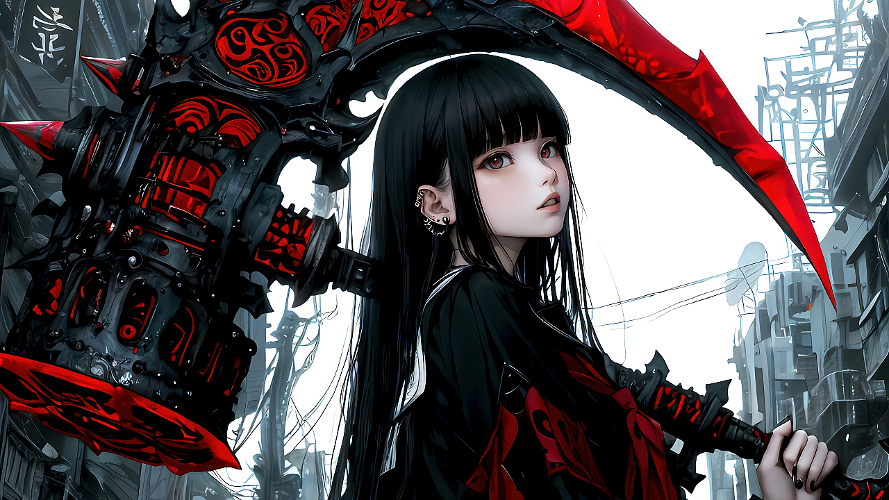 Anime girl, hammer, scythe, weapon, fantasy, girl, weaponry, reaper, harvest maiden, anime wallpaper, death, dark fantasy, battle, warrior girl, gothic