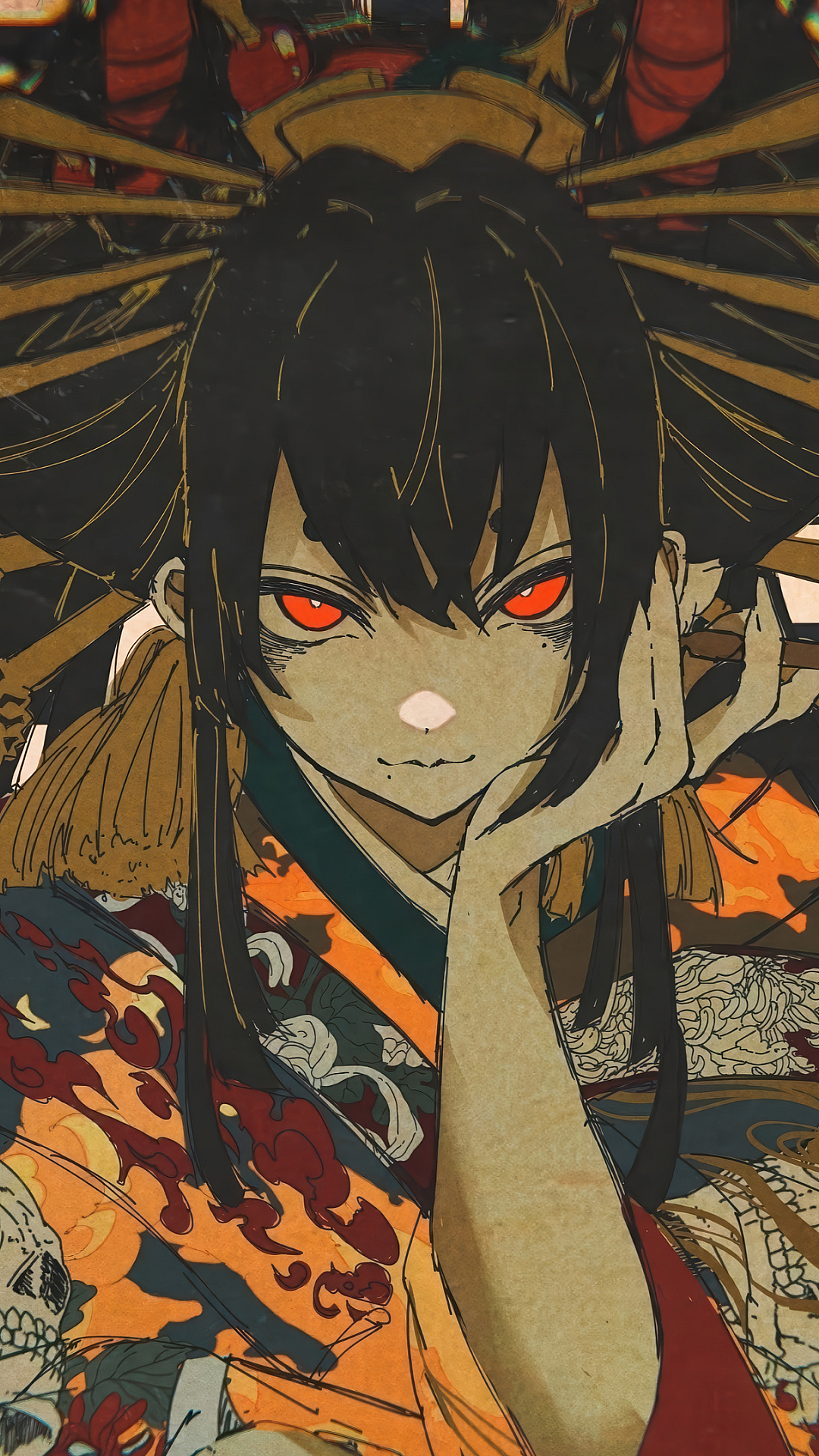 Anime girl, kimono, red eyes, red-haired, Japanese girl, traditional clothing, wallpaper, background, desktop wallpaper, phone wallpaper, anime wallpaper, girl wallpaper, crimson eyes, scarlet eyes, manga girl
