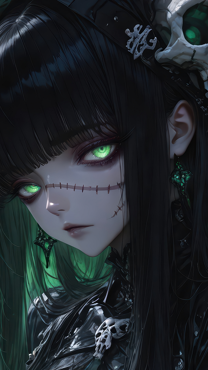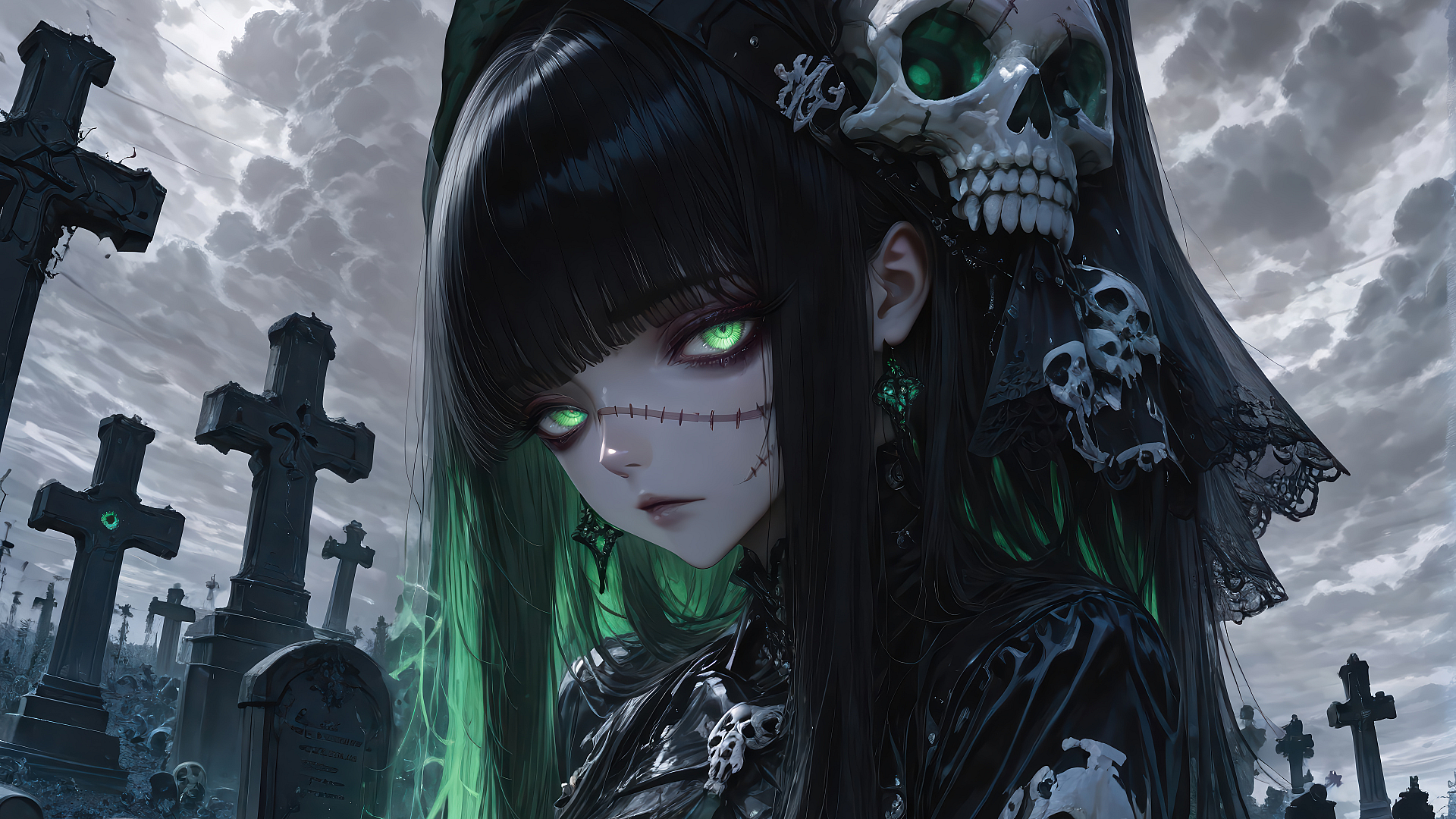 anime girl, skull, graveyard, cemetery, gothic, dark, death, fantasy, macabre, creepy, halloween, bones, skeleton, tombstones, grim reaper