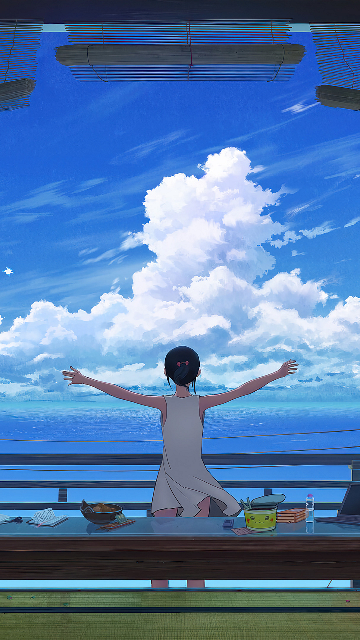 This stunning wallpaper features an anime girl enjoying a beautiful summer day at the ocean. The vibrant scenery includes a breathtaking seaside view, perfect for anyone who loves summer vibes and anime art.