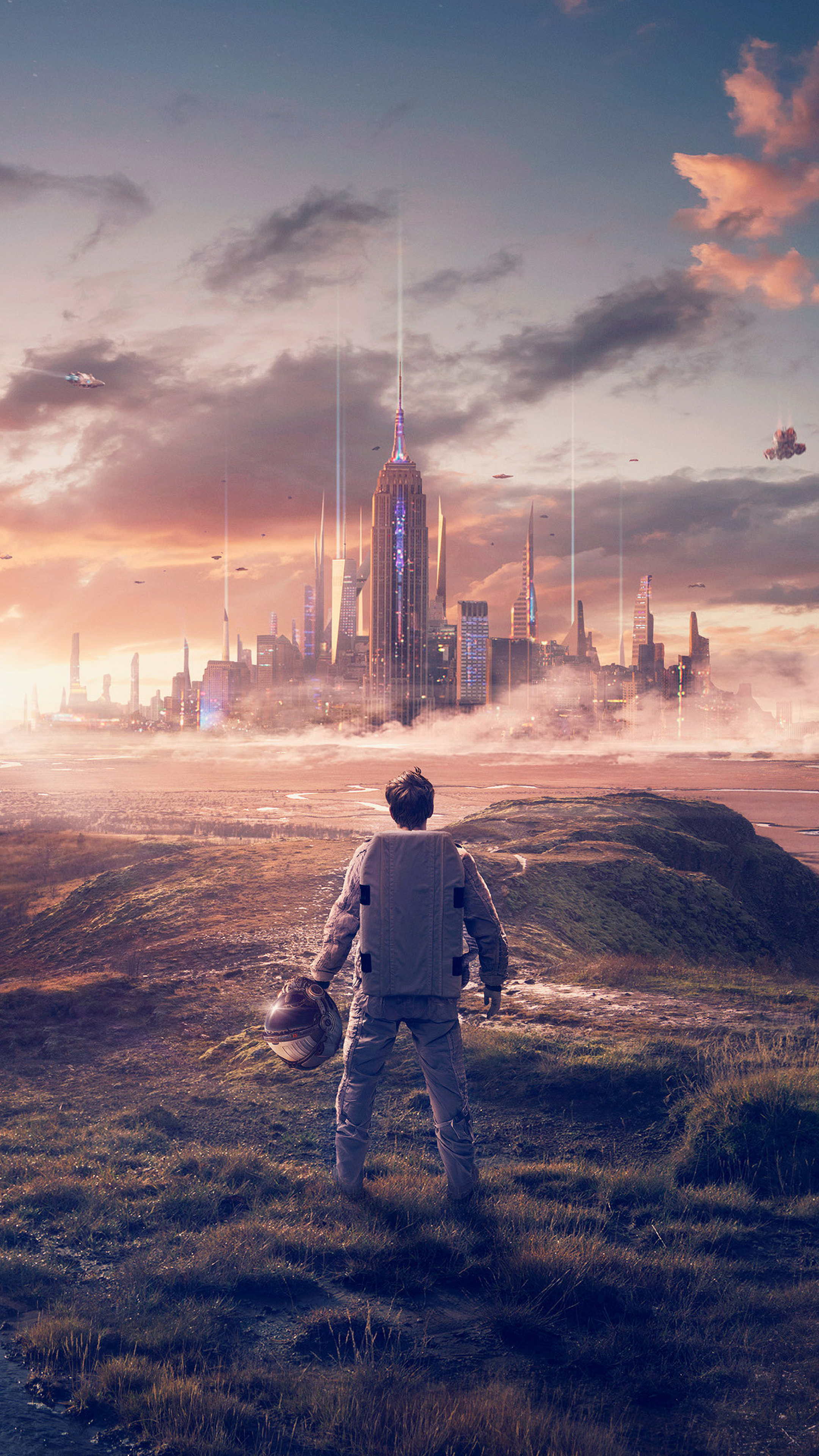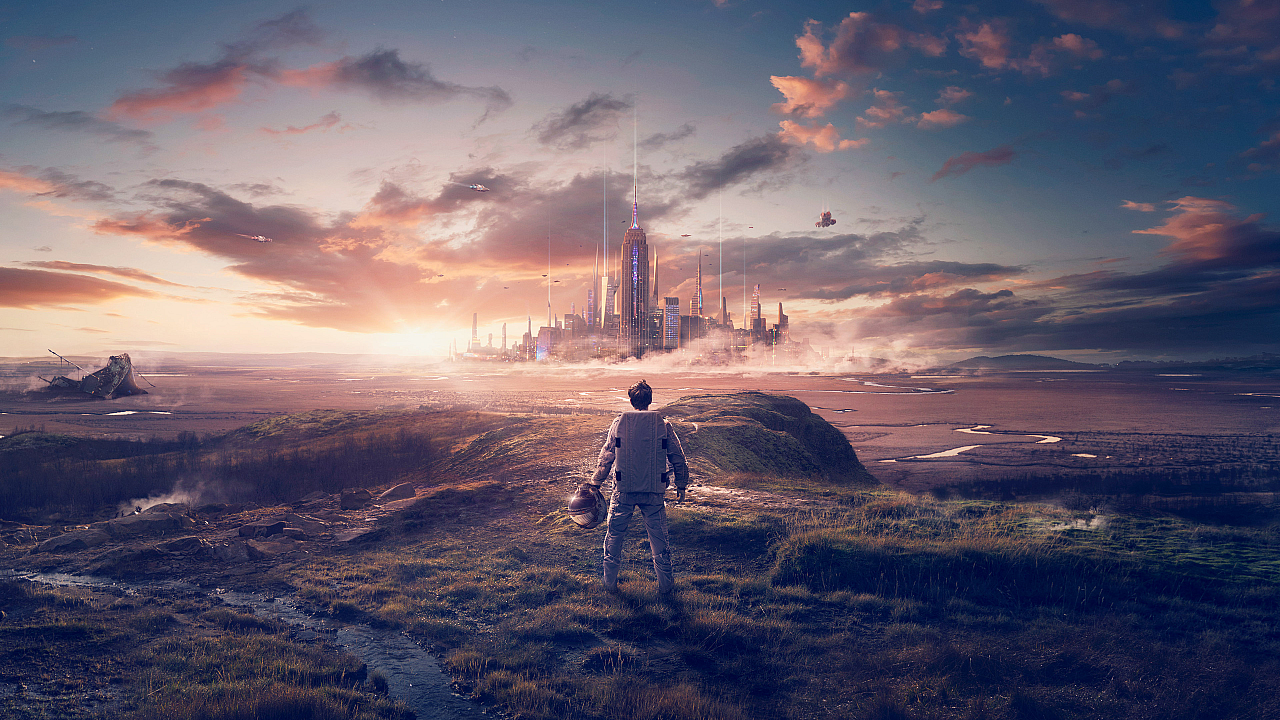 astronaut, landscape, sci-fi, city, space, futuristic, wallpaper, background, digital art, science fiction, urban, cosmos, extraterrestrial, colony, spacescape