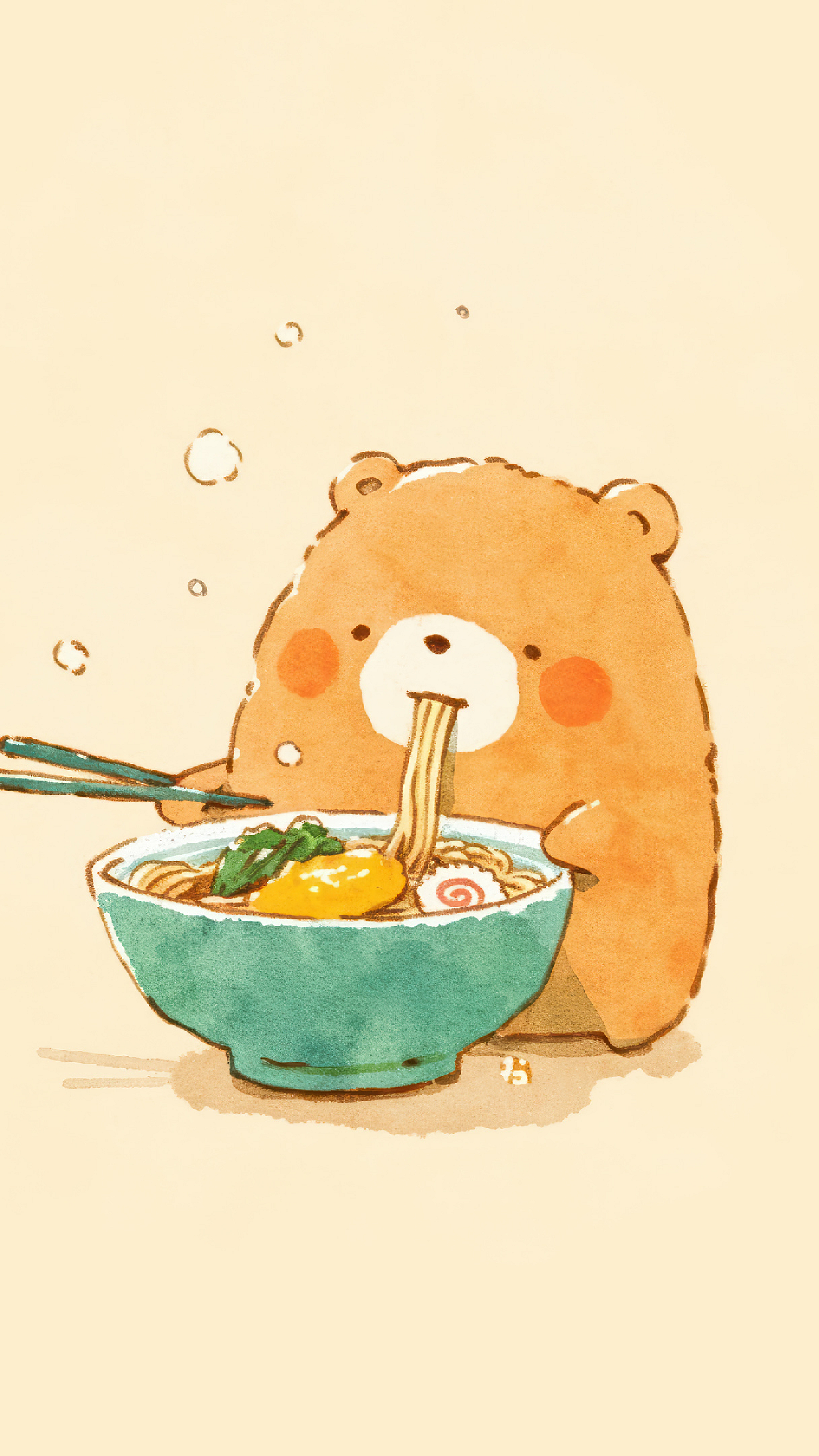 This captivating wallpaper features a charming chibi style bear happily indulging in a steaming bowl of ramen. The anime inspired art is incredibly cute and perfect for fans of adorable characters and delicious food.