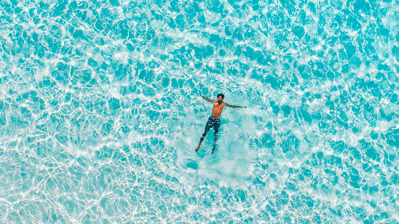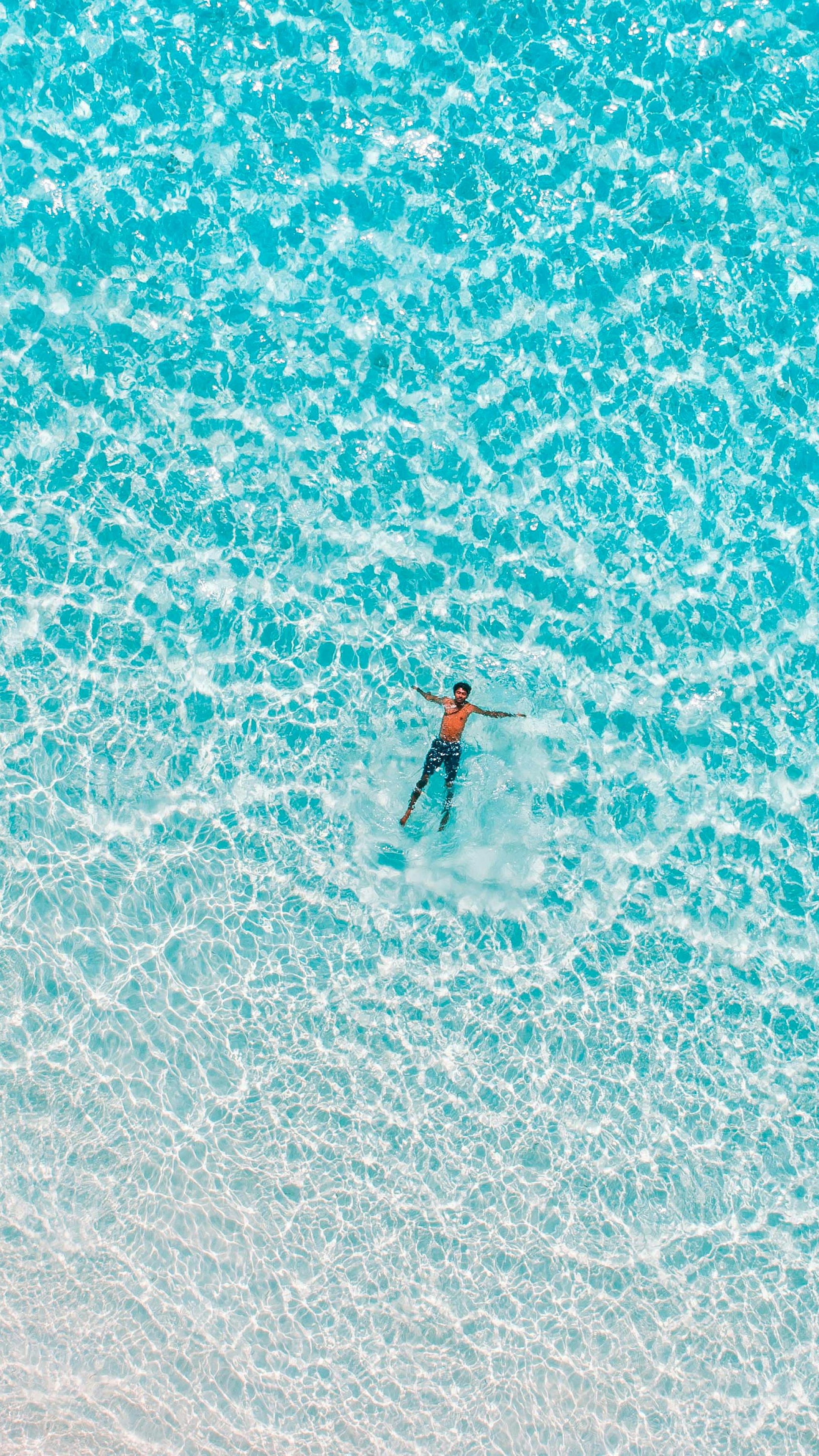 bird’s eye view, aerial view, overhead view, man, person, water, body of water, lake, ocean, sea, river, pond, standing, alone, solitude