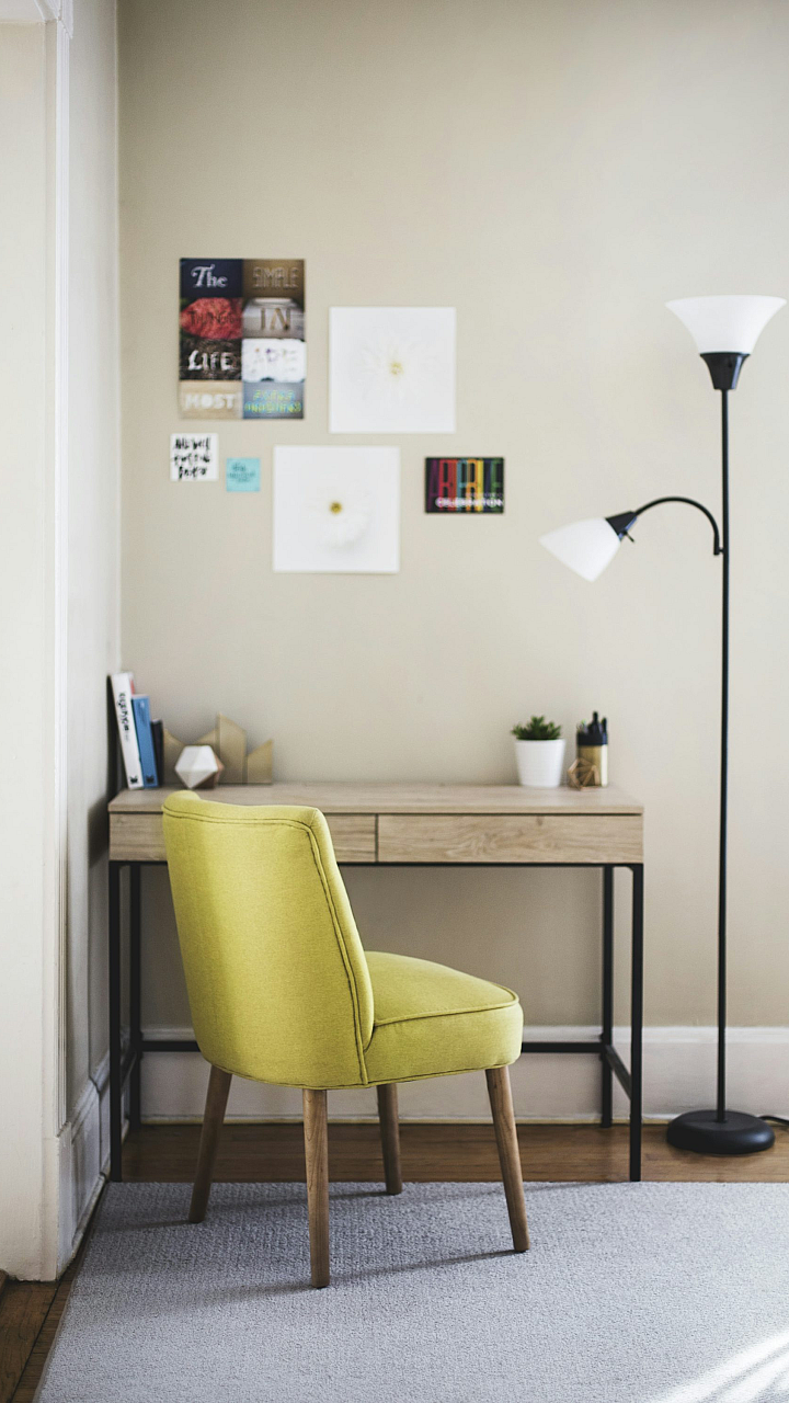 black torchiere, black lamp, desk lamp, torchiere floor lamp, brown wooden desk, wooden desk, steel desk frame, black steel frame, office desk, work desk, lighting, home office, interior design, modern furniture, minimalist decor