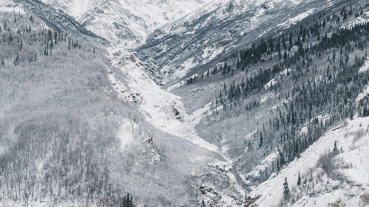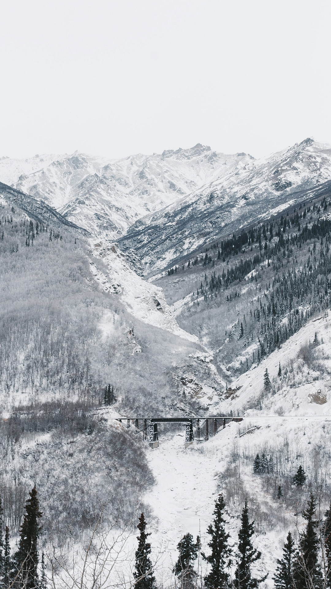 This stunning wallpaper features a black bridge dramatically positioned against a backdrop of snow-covered mountains. The white sky adds to the stark contrast, creating a visually striking and serene image. The mountain range stretches as far as the eye can see, emphasizing the vastness and beauty of the winter landscape.