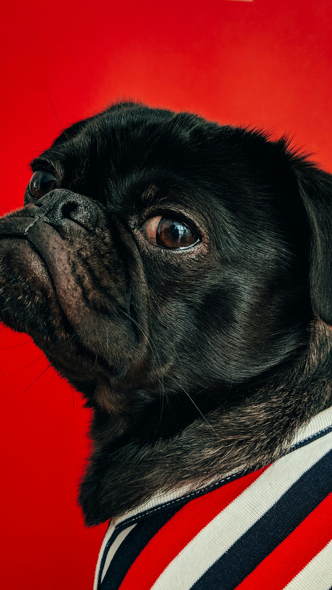 black pug, pug, striped apparel, striped clothing, dog wallpaper, pug wallpaper, black dog, cute pug, adorable pug, pet wallpaper, animal wallpaper, dog clothes, fashion pug, stylish pug, pet fashion