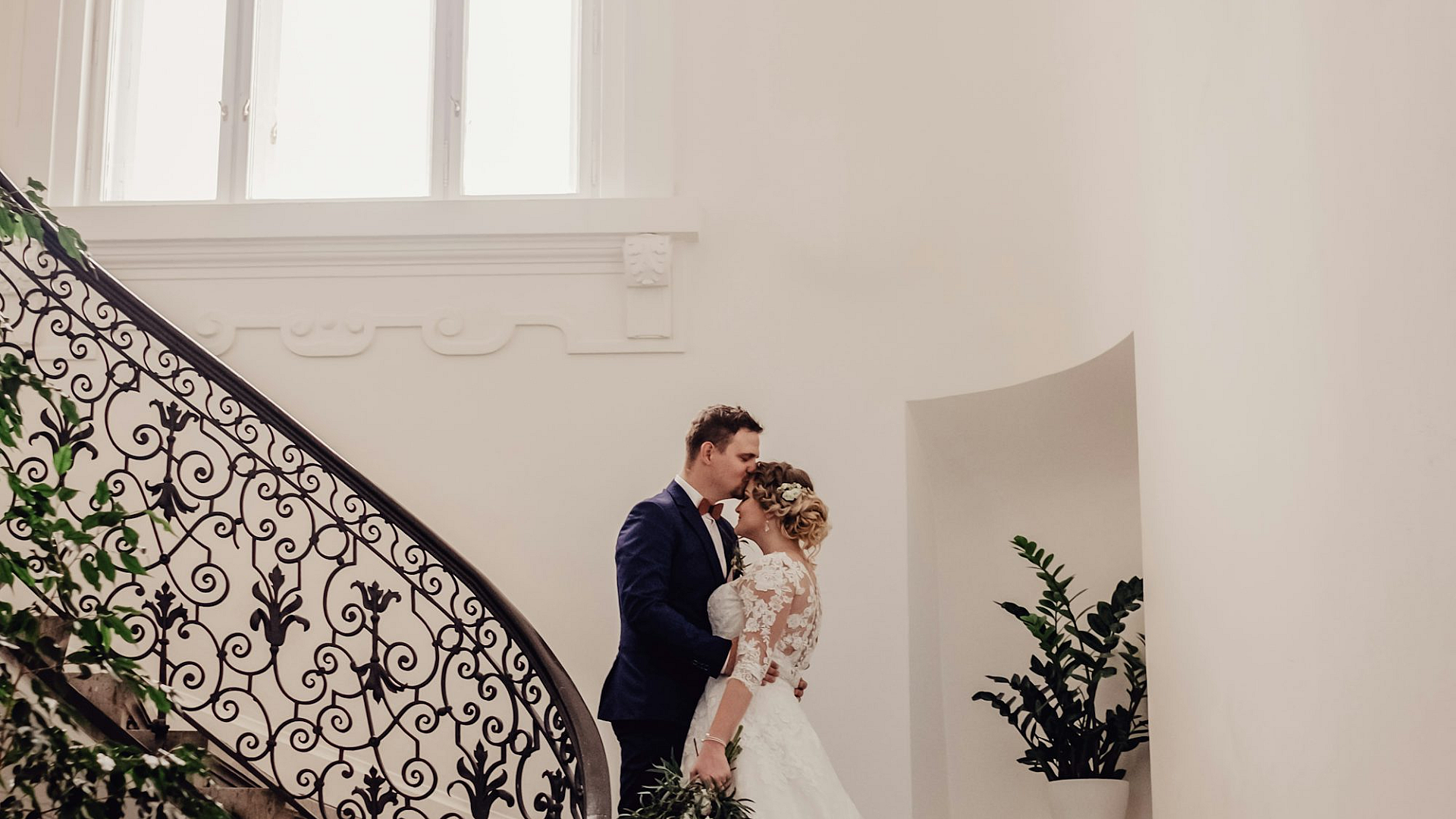 This stunning wallpaper features a bride and groom standing elegantly on a grand staircase. The image captures the romance and love of their special day, making it a perfect addition to your desktop or mobile device.