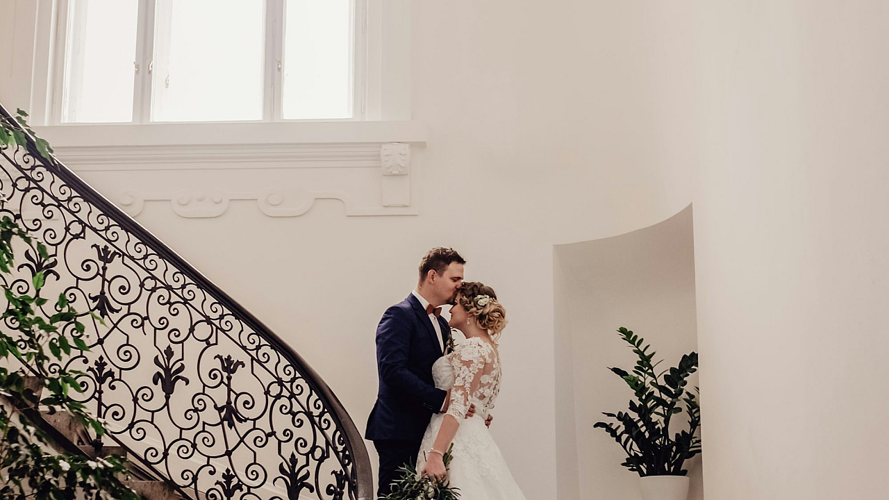 Download this wallpaper and let the beautiful image of the bride and groom on the stairs bring a touch of romance to your digital world. The perfect blend of classic and modern aesthetics.