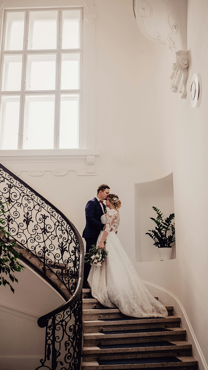bride, groom, stairs, wedding, couple, marriage, love, romance, staircase, steps, elegant, formal, portrait, photography, newlyweds