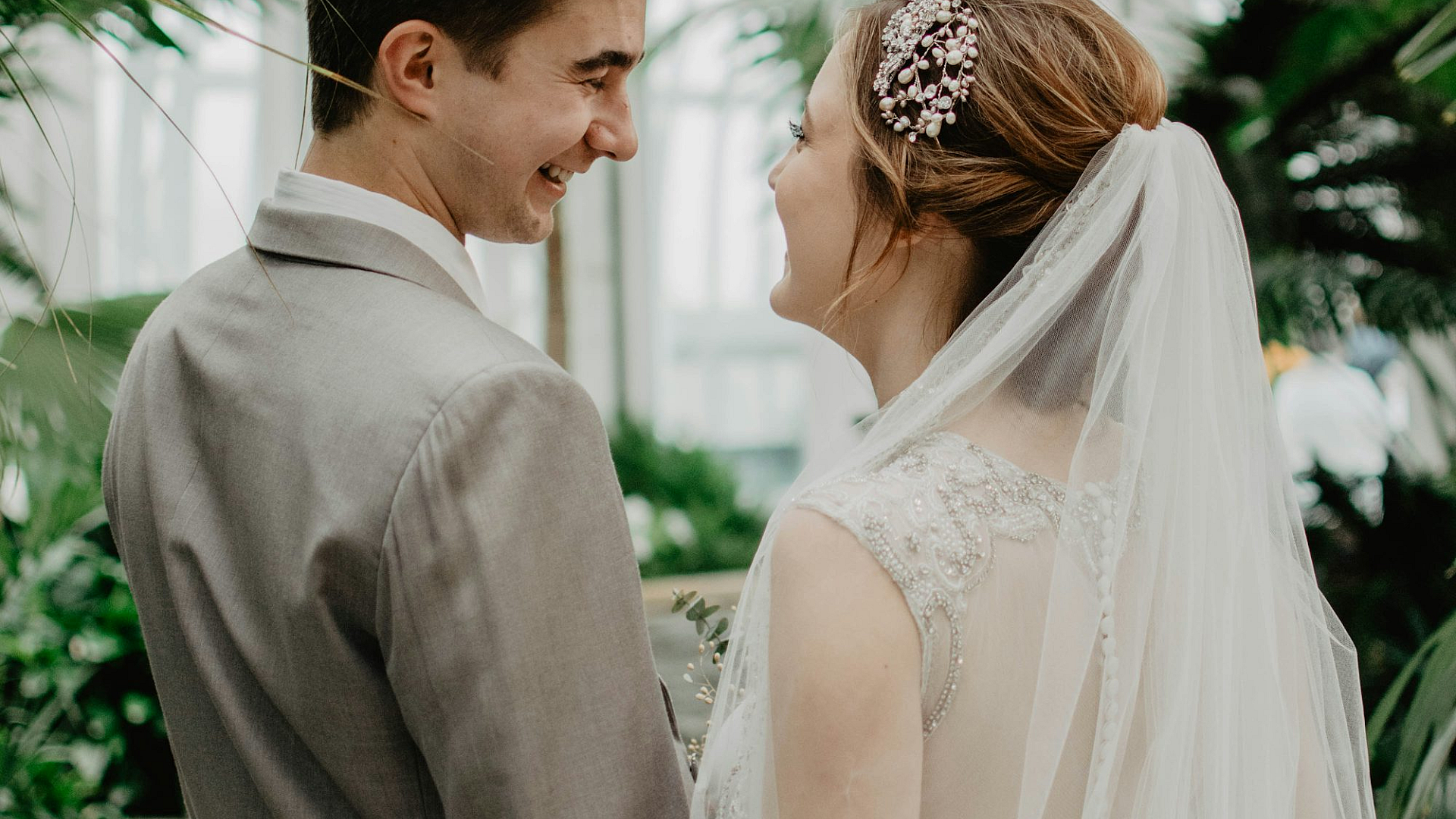 The image’s color palette is dominated by shades of green, suggesting a peaceful and calming atmosphere, making it a perfect addition to any space. The intricate details of the plants and the happy expressions of the bride and groom contribute to the image’s overall charm, ensuring a visually appealing and emotionally resonant wallpaper choice.